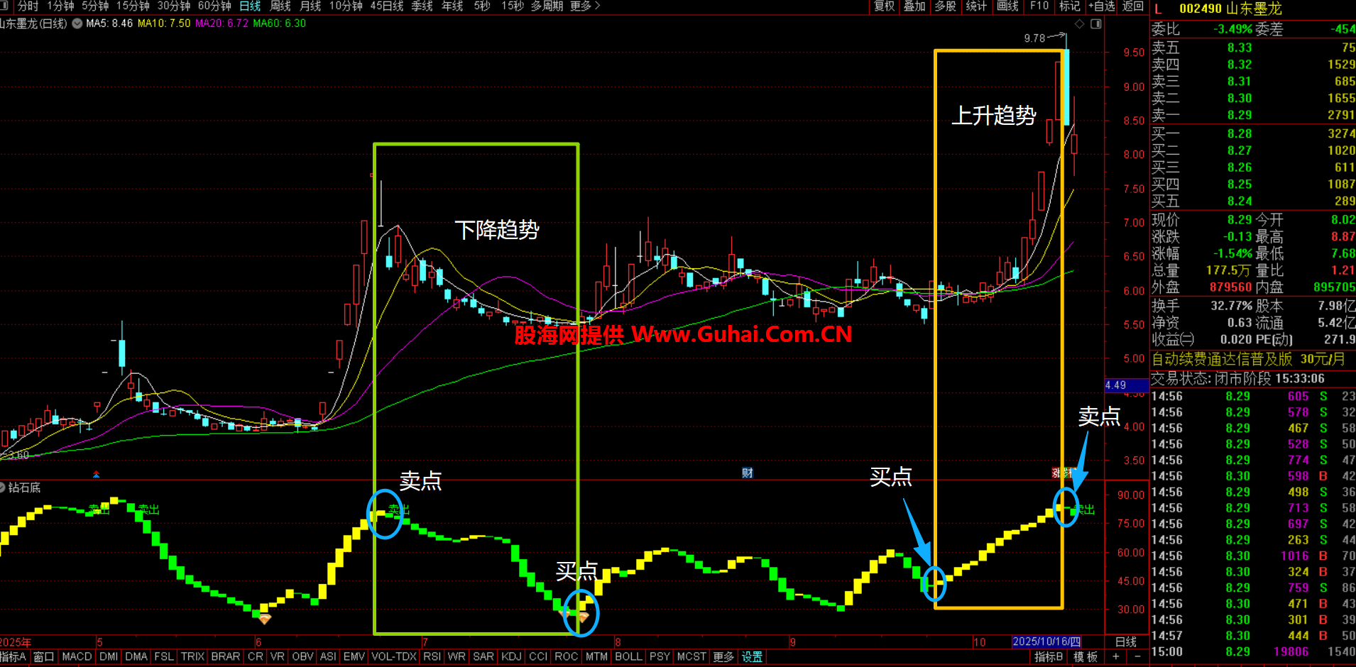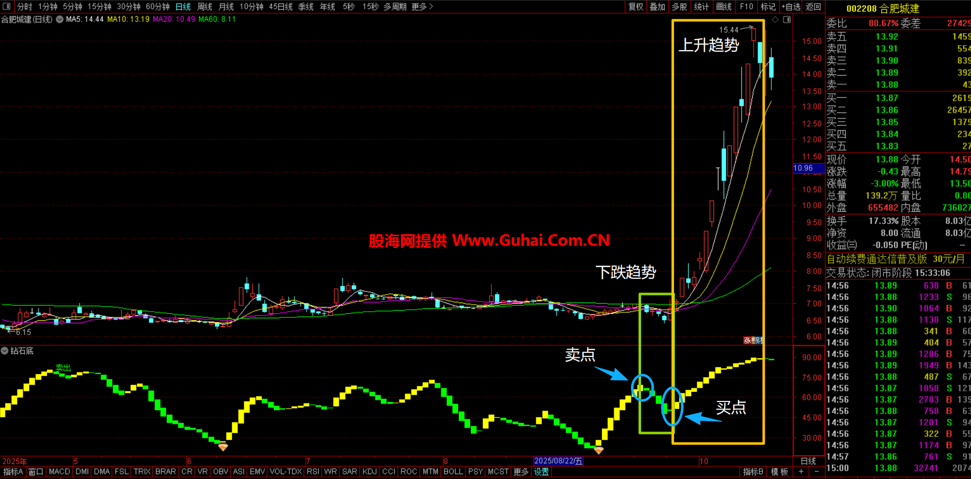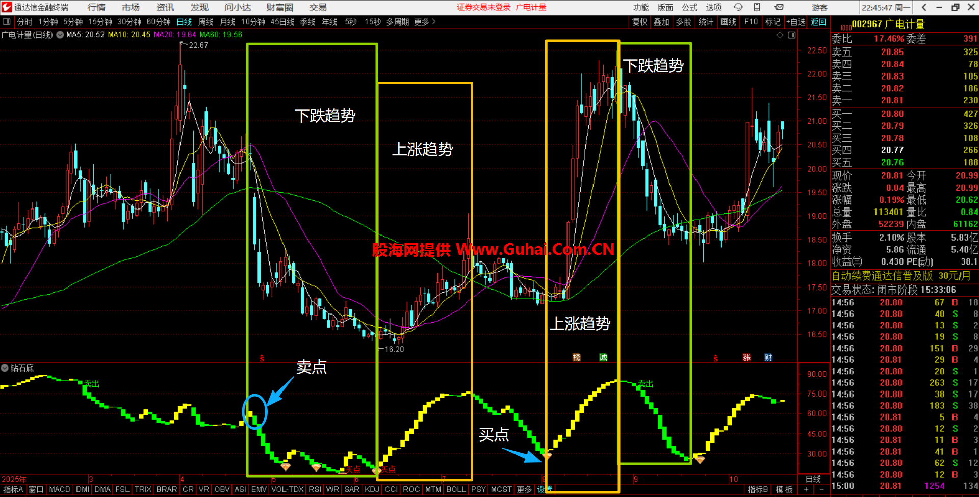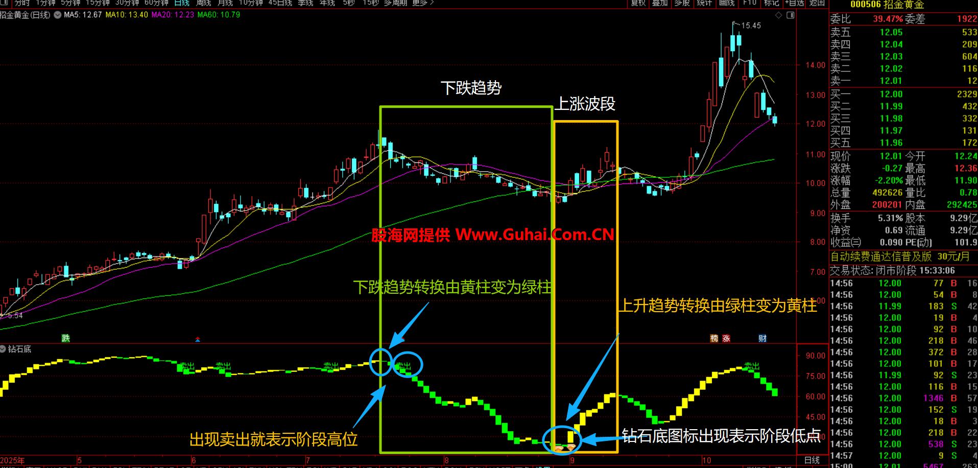 下跌趋势:由黄柱转绿柱,可以逢高卖出
