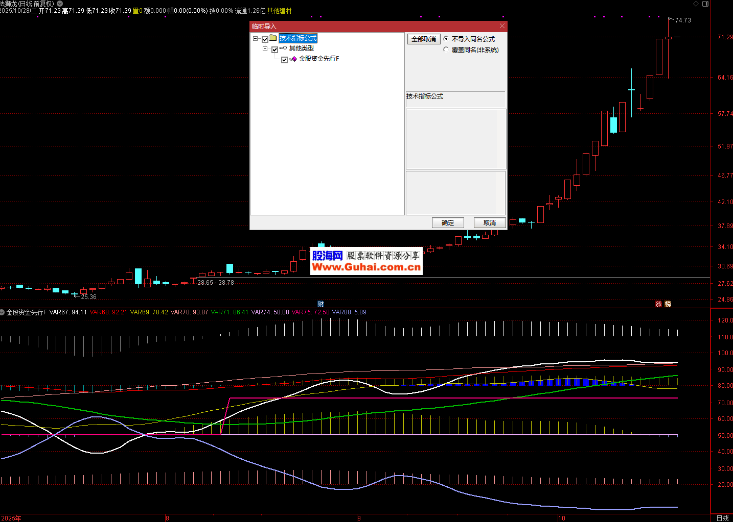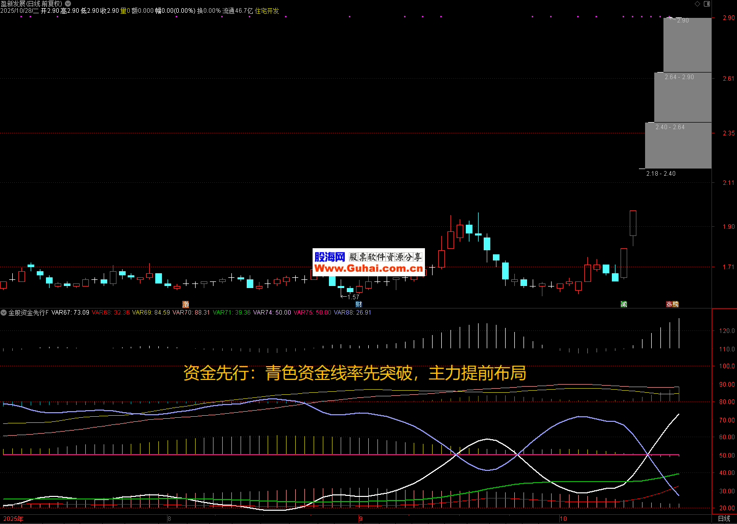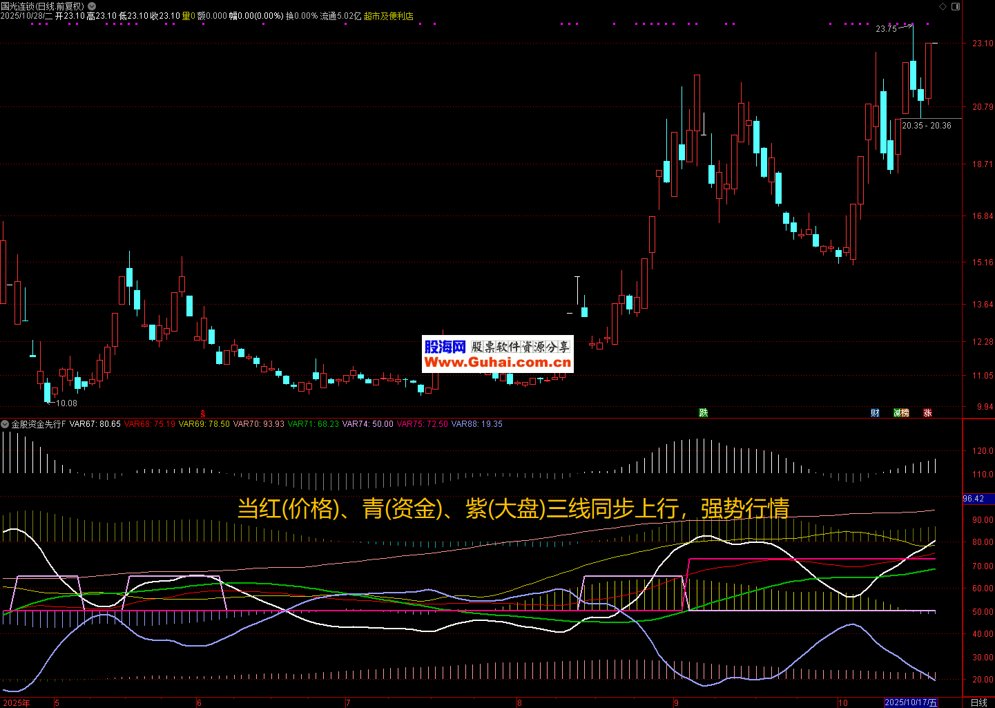 三线共振:当红(价格)、青(资金)、紫(大盘)三线同步上行,强势行情;