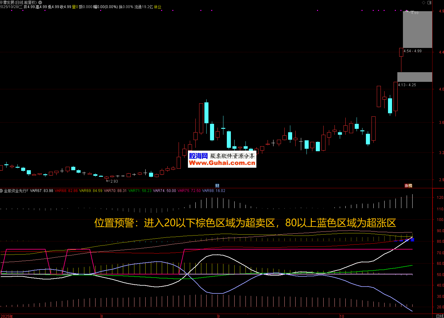 -位置预警:进入20以下棕色区域为超卖区,80以上蓝色区域为超涨区;