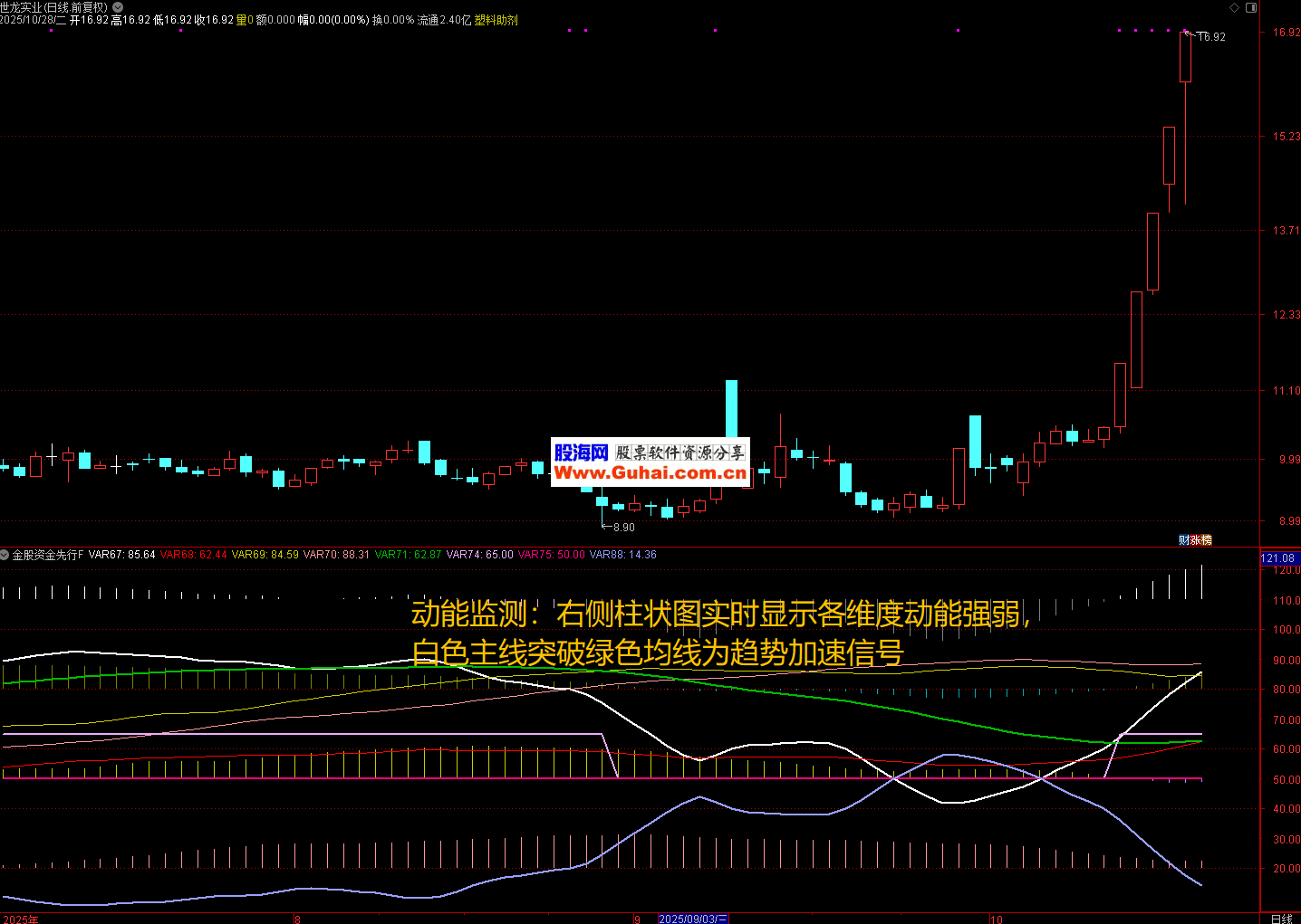 -动能监测:右侧柱状图实时显示各维度动能强弱,白色主线突破绿色均线为趋势加速信号。