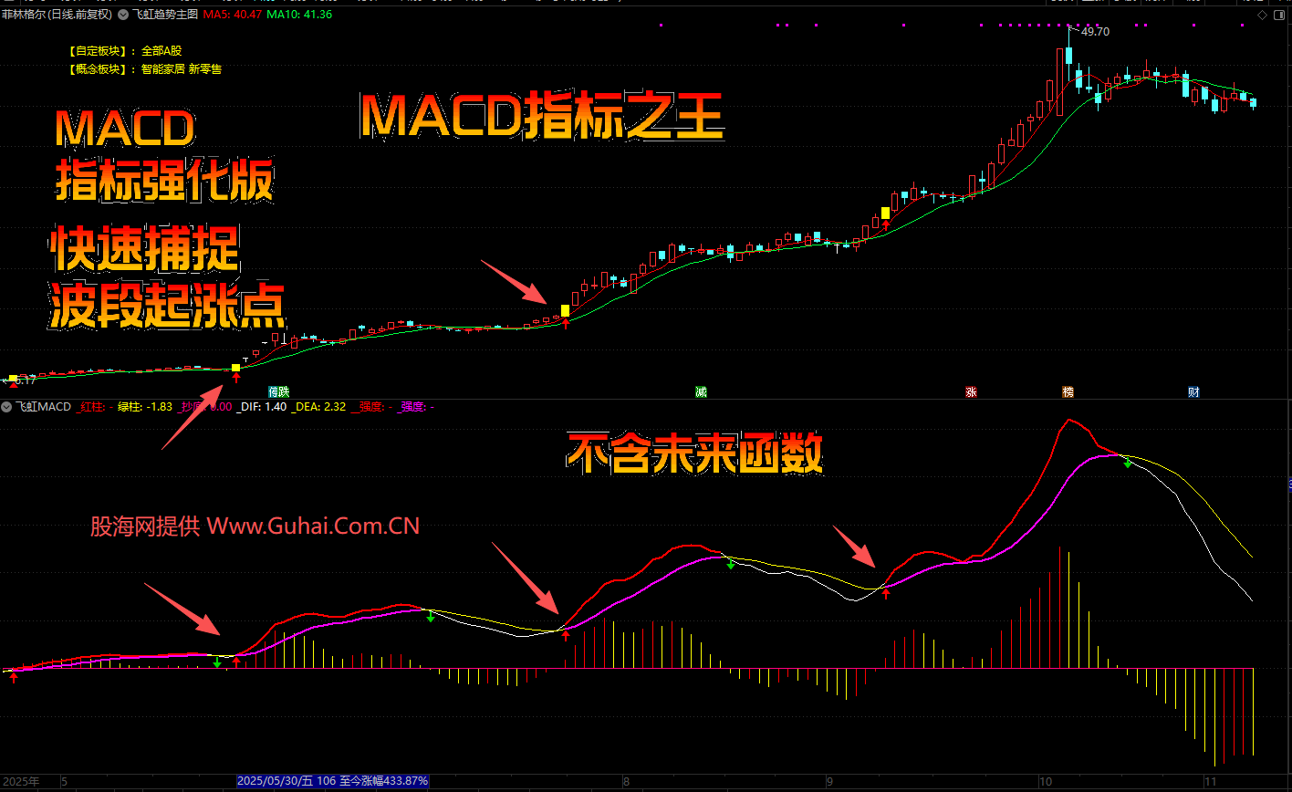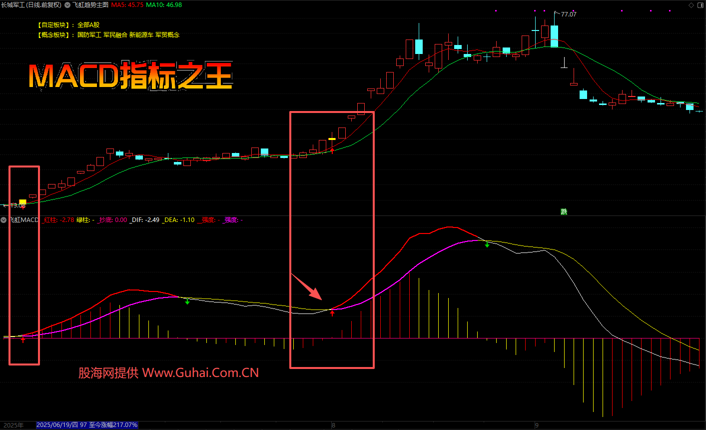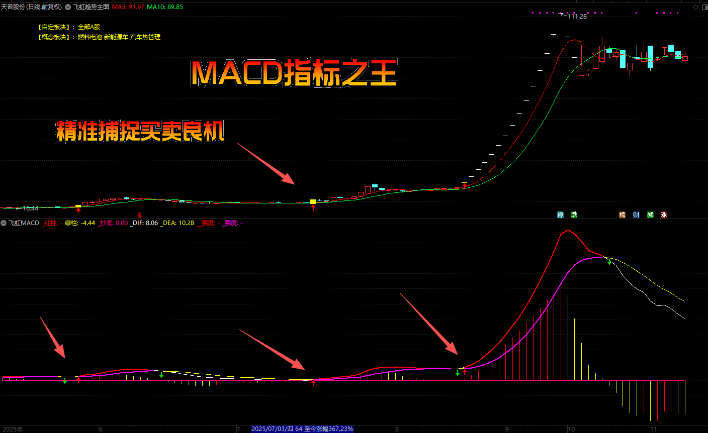 1、金叉(DIF上穿DEA)→ 白色箭头↑,强势买入信号!
