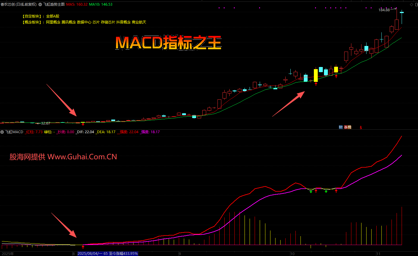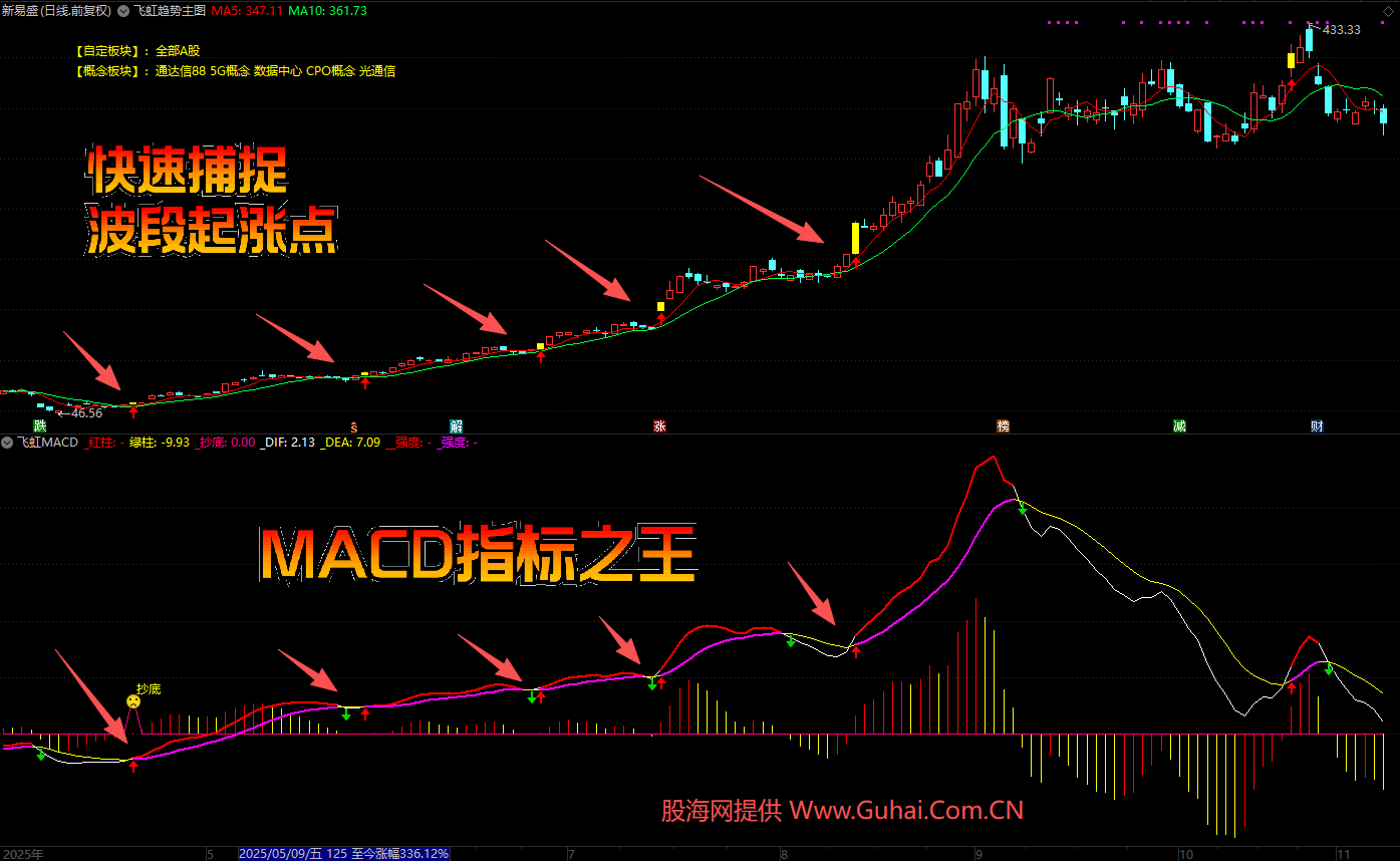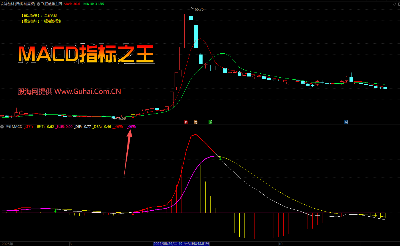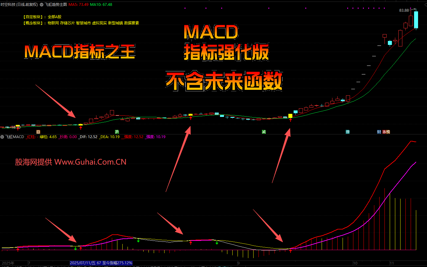 1、金叉(DIF上穿DEA)→ 白色箭头↑,强势买入信号!