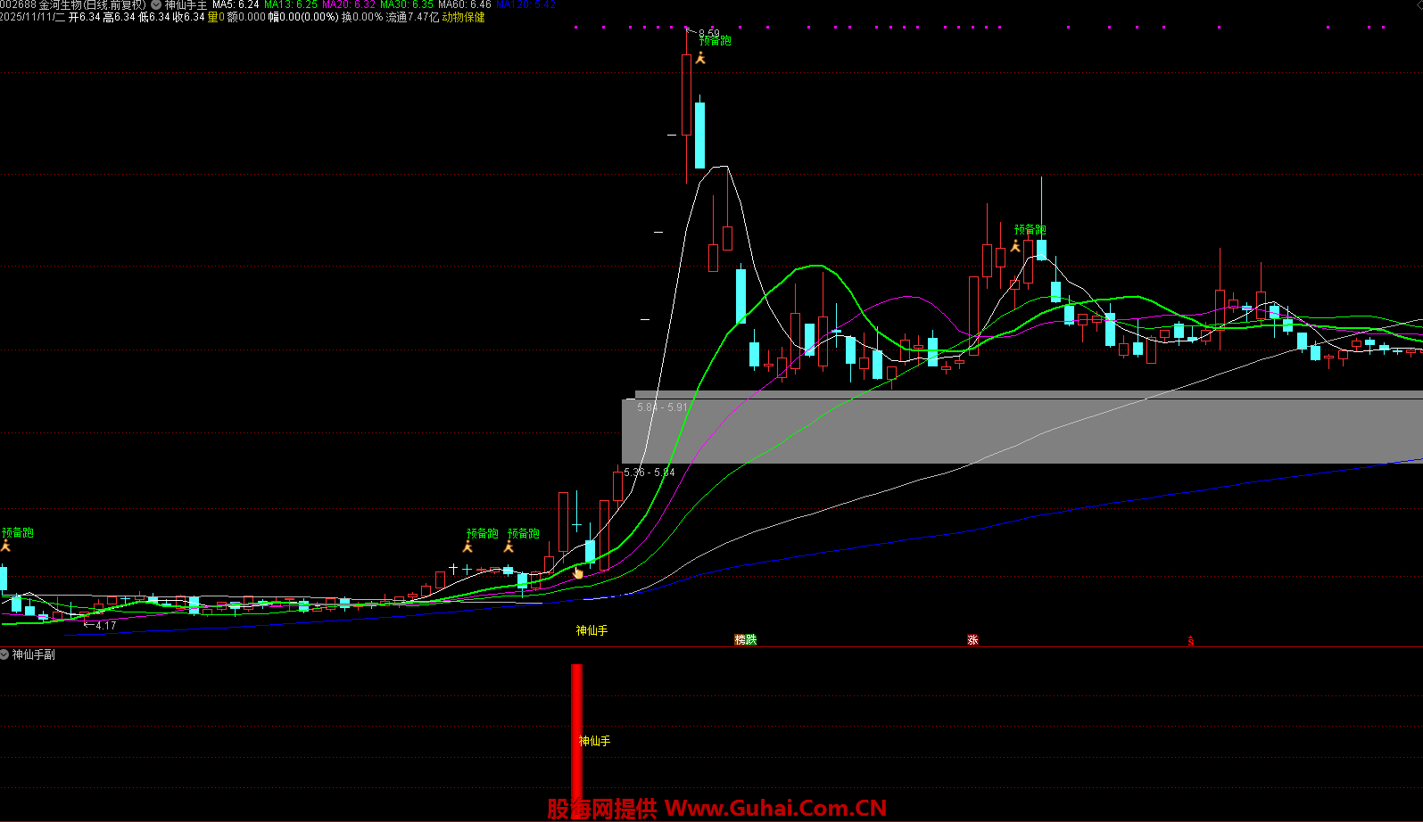 “神仙手”信号——前日涨停后当日低开3%-6%且不破前日开盘价,形成十字星或小K线,属洗盘形态,后市或延续上涨动能。