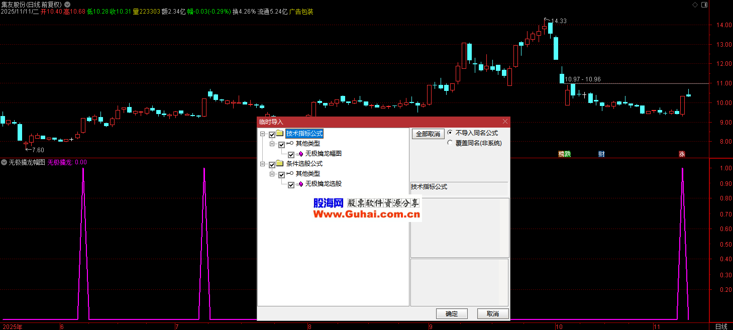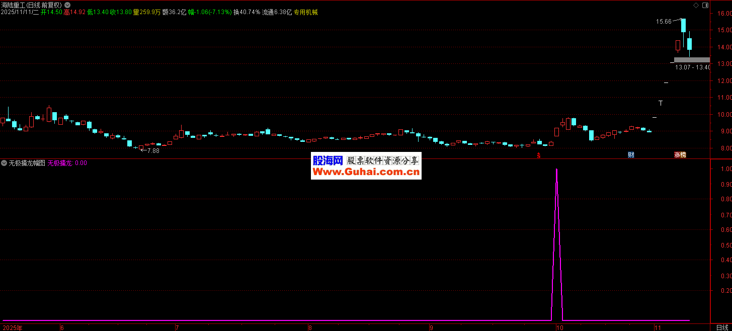 - 信号解读:当指标显示洋红色粗线时,触发 “无极擒龙” 信号,代表个股可能处于短期强势突破阶段,满足暴利或妖股突破条件,且伴随成交量放大、价格大幅上涨等特征。