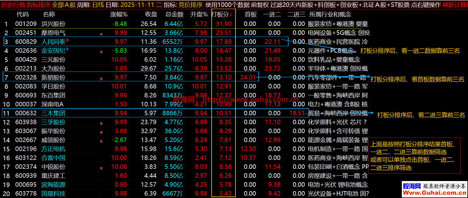 5、打板分排序是对所有的个股进行打分后、注意个股已经几个涨停板的票不宜介入、高位风险大,最后面可了解热门