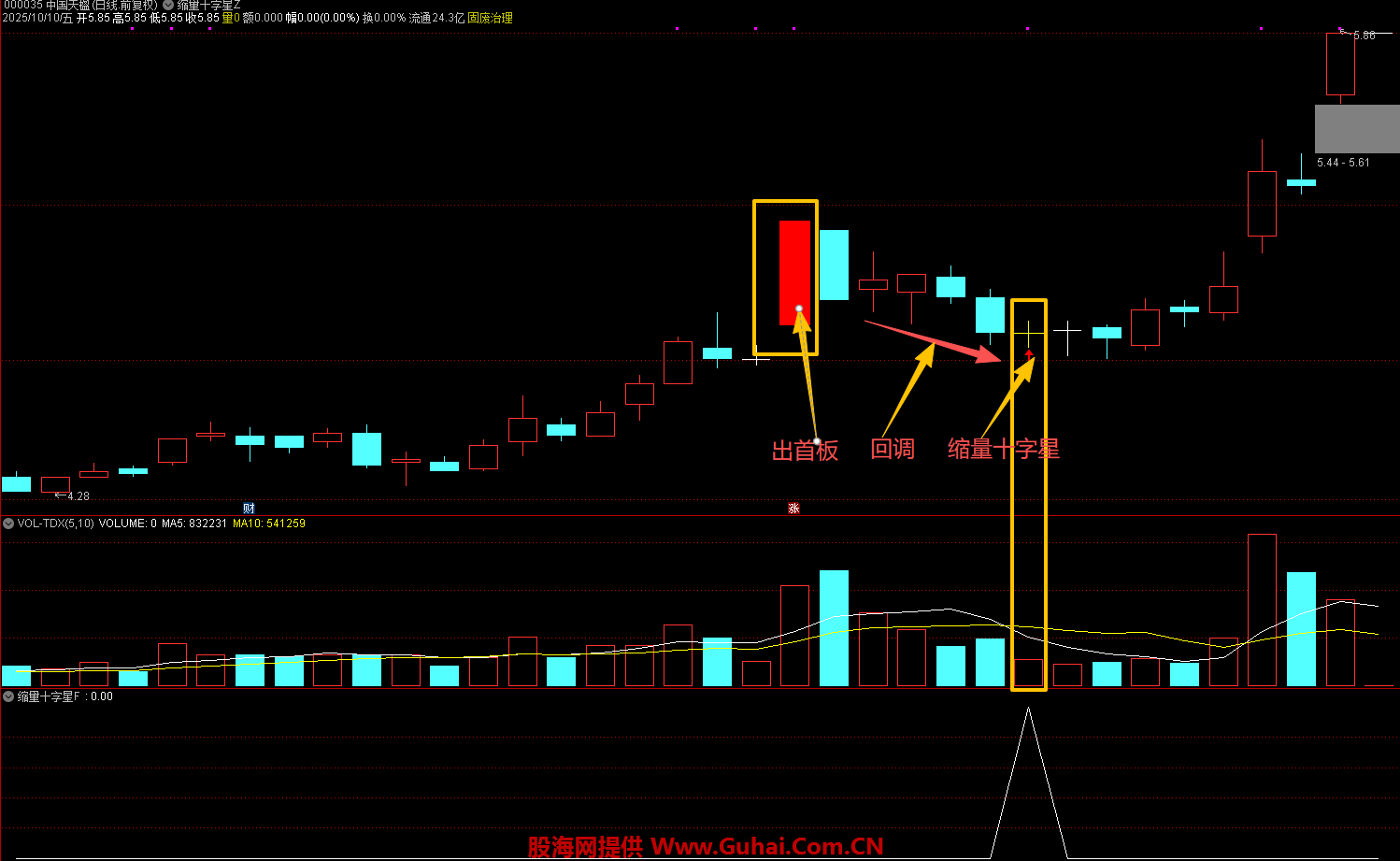 本指标用于识别近5日内出现非一字板、非T字板的实体首板,随后股价持续回调、重心下移,且量能整体呈现缩量趋势,直至出现首板以来最小量能的十字星信号。