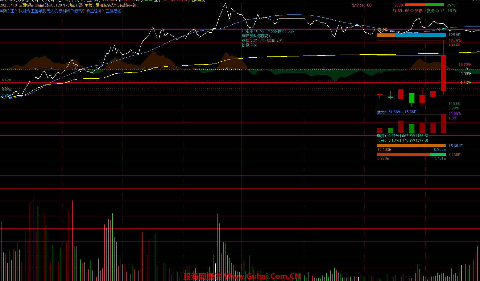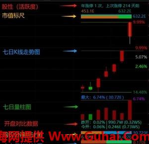一、K线面板:包含七组数据,分别是股性提示、市值标尺、K线走势图、量柱图、开盘对比数据、均价分隔统计图和主力量能统计图。