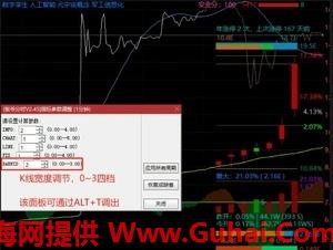 8、K线面板宽度调节:【新增】可以通过指标参数设置K线面板中K线的胖瘦,改变K线面板的宽窄,以适应自己的显示器。(0~3,总共四档,0最瘦,3最胖)。