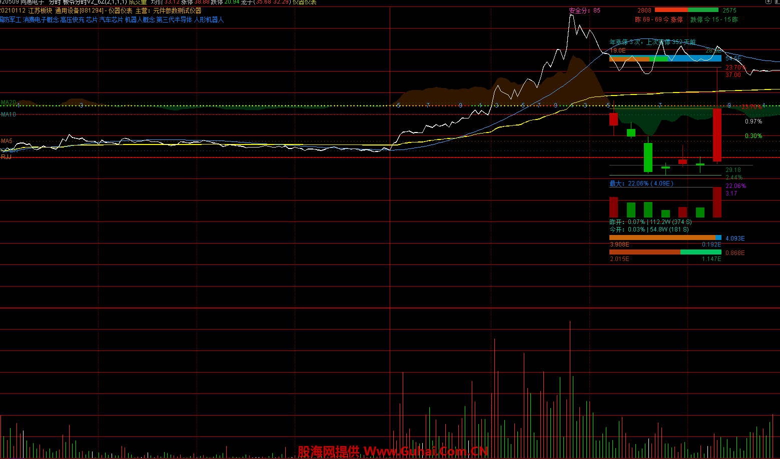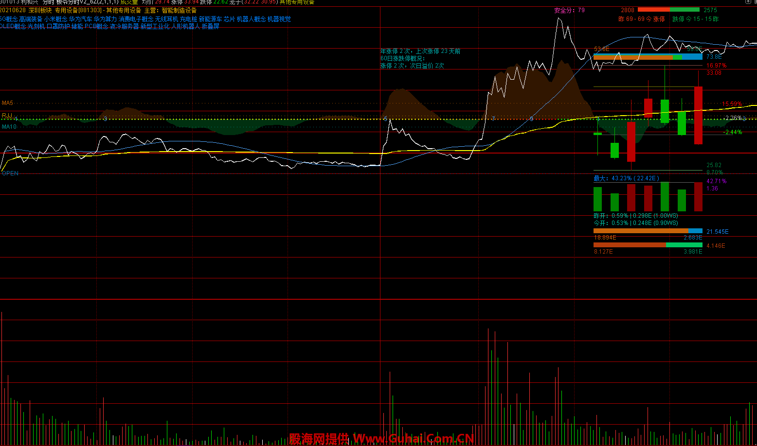 3、今昨量能比标尺:以前交易日成交量为基础,当下成交量占比前交易量的比值,数值1、3、5、7、9分别代表10%、30%、50%、70%、90%。标尺采用绿到红渐变,一个渐变周期就是一倍前交易量,标尺最后是动态值是当前量是前交易量的多少倍。收盘后这个动态量会显示在K线面板中量柱右侧当日自由换手率下方。
