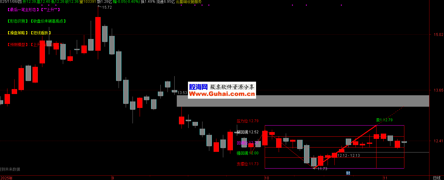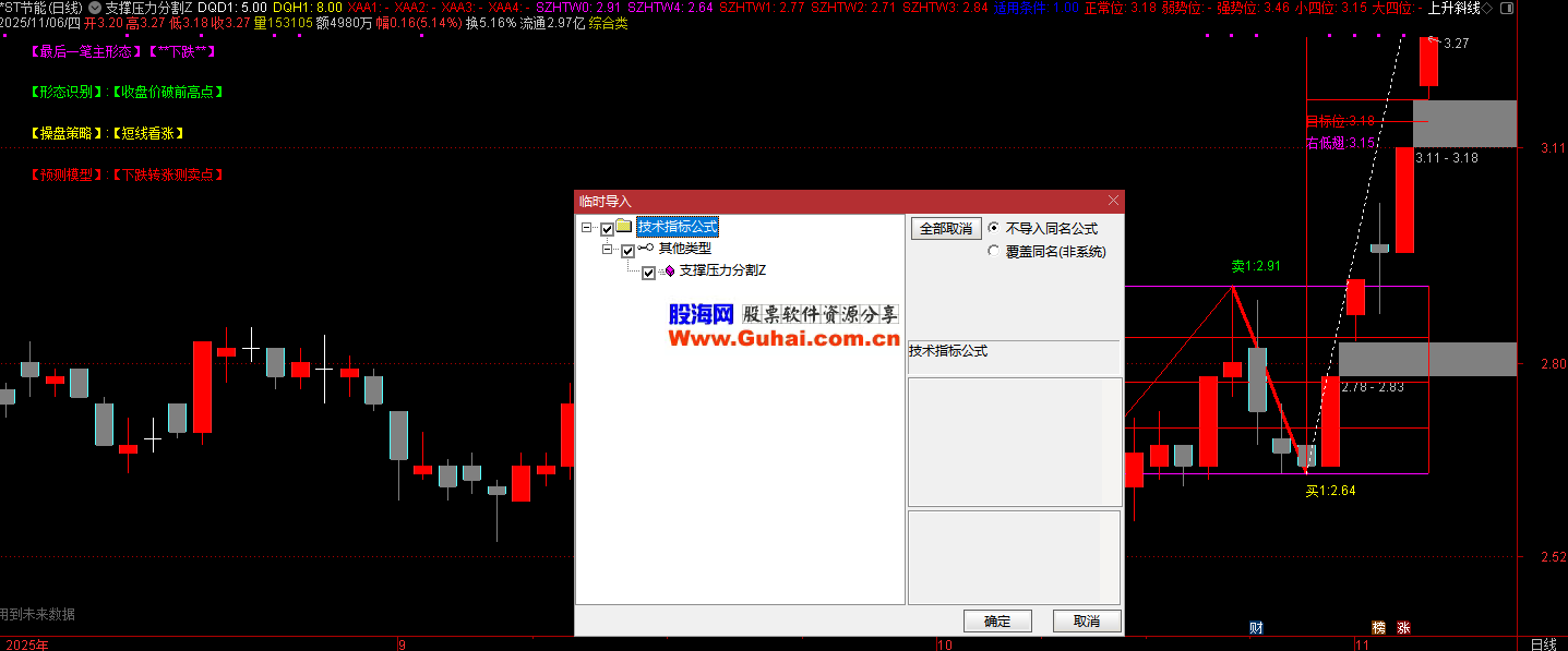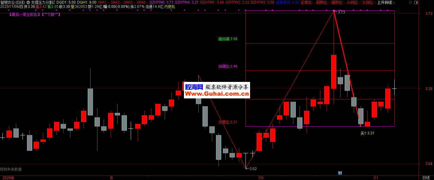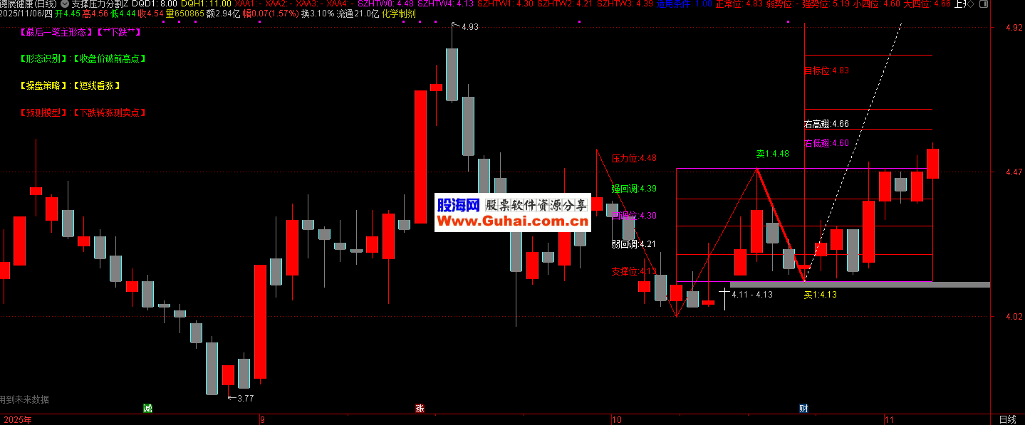 此指标可以明确的标注出支撑 压力位相关数据,左上方有文字提示,能帮助做判断。参考使用