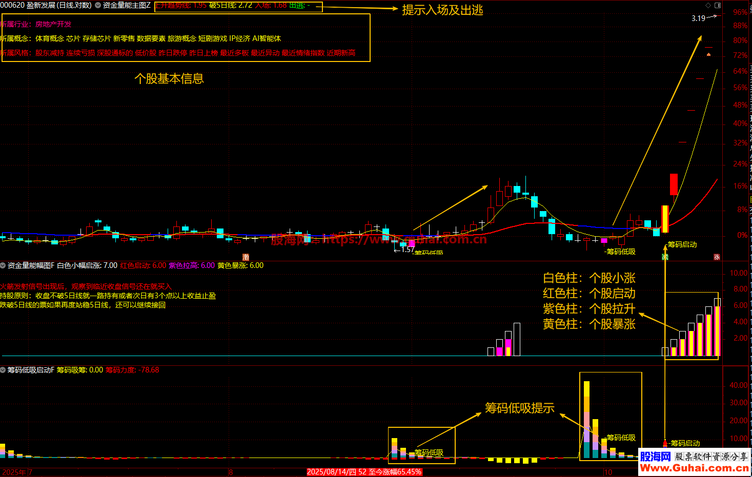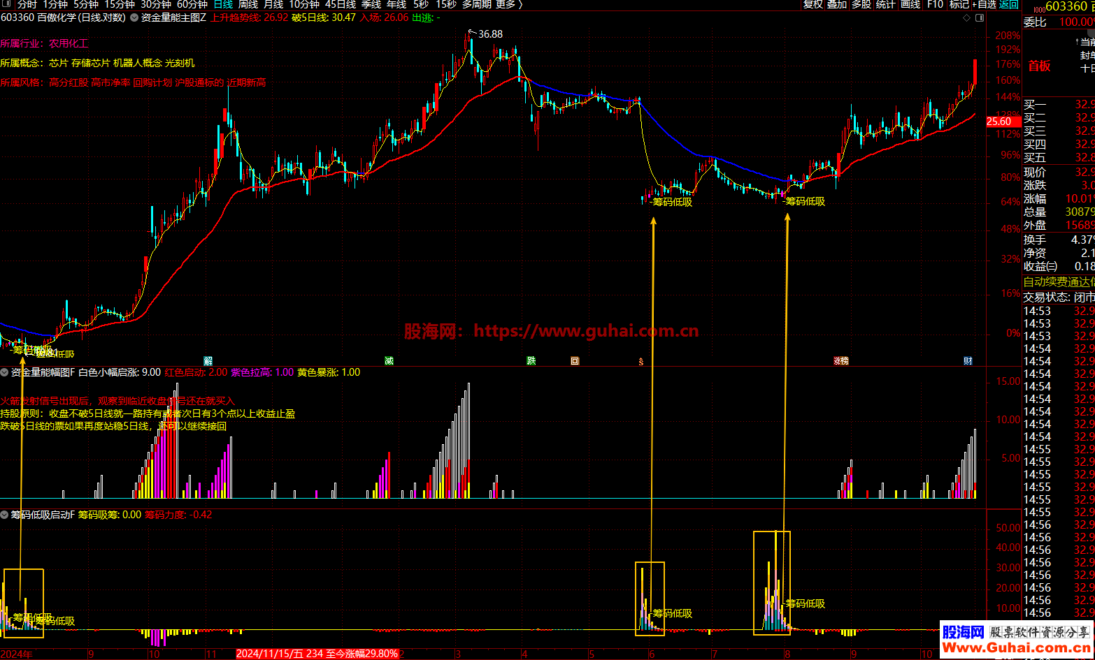 这是一个综合性的资金筹码监控系统,通过量价、筹码、资金三个维度精准捕捉低吸及拉升等信号: