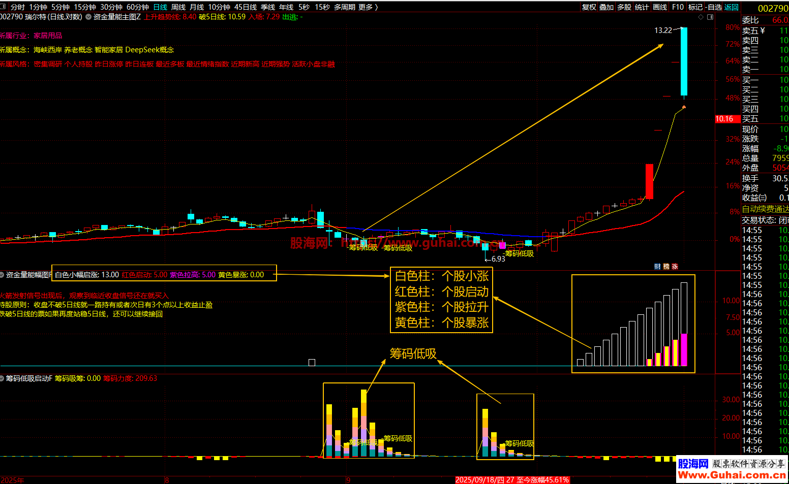 如案例图中0轴向上五种颜色量柱提示筹码吸筹