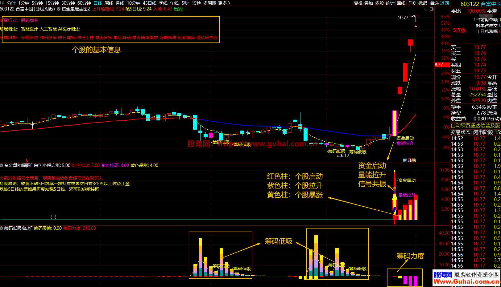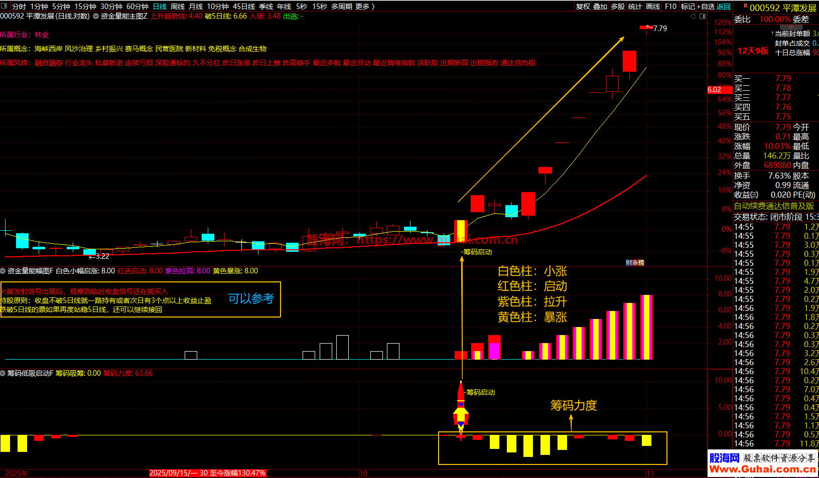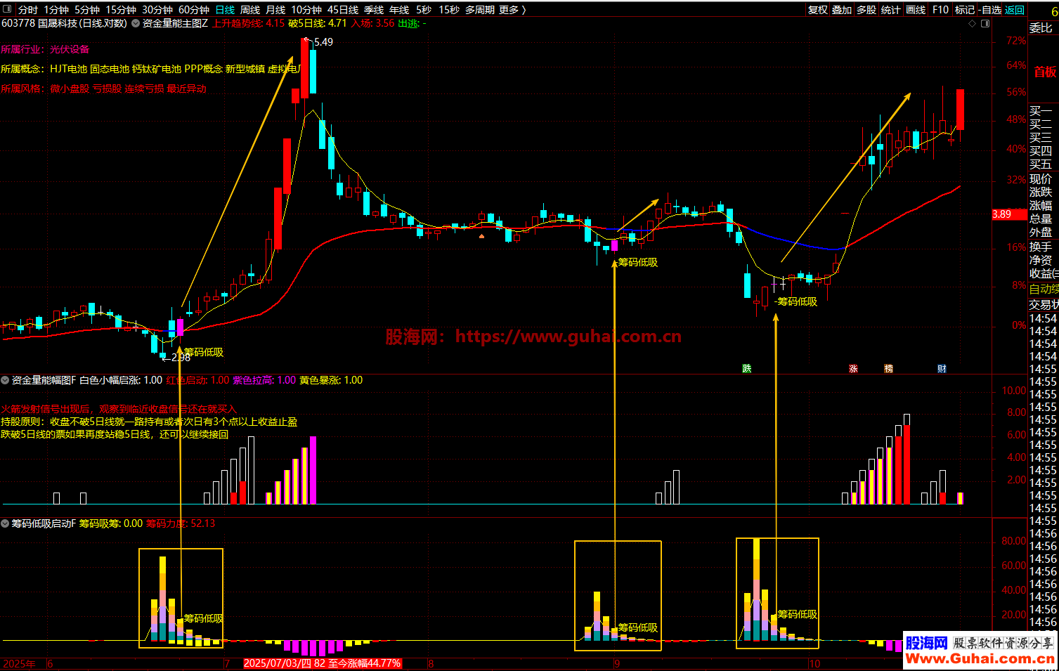 1、资金启动信号:突破55/144/233日三重均线、金叉、量比>1.2且涨幅>1%、短期量能达标(白色/红色)