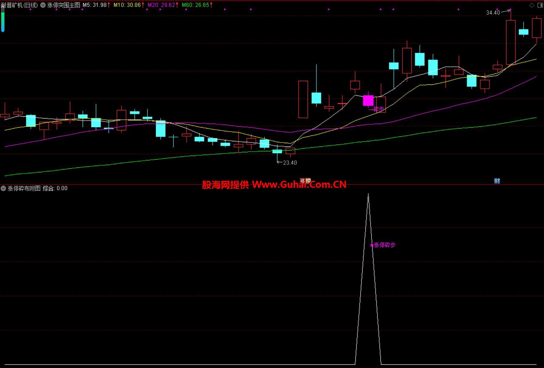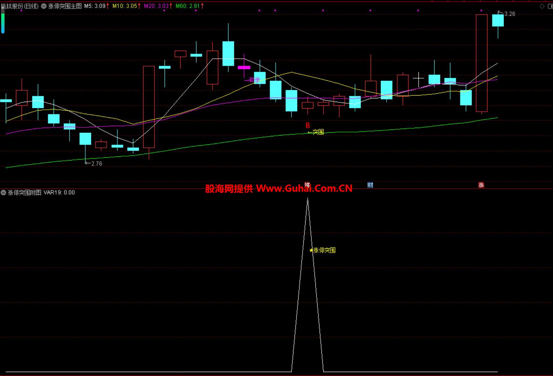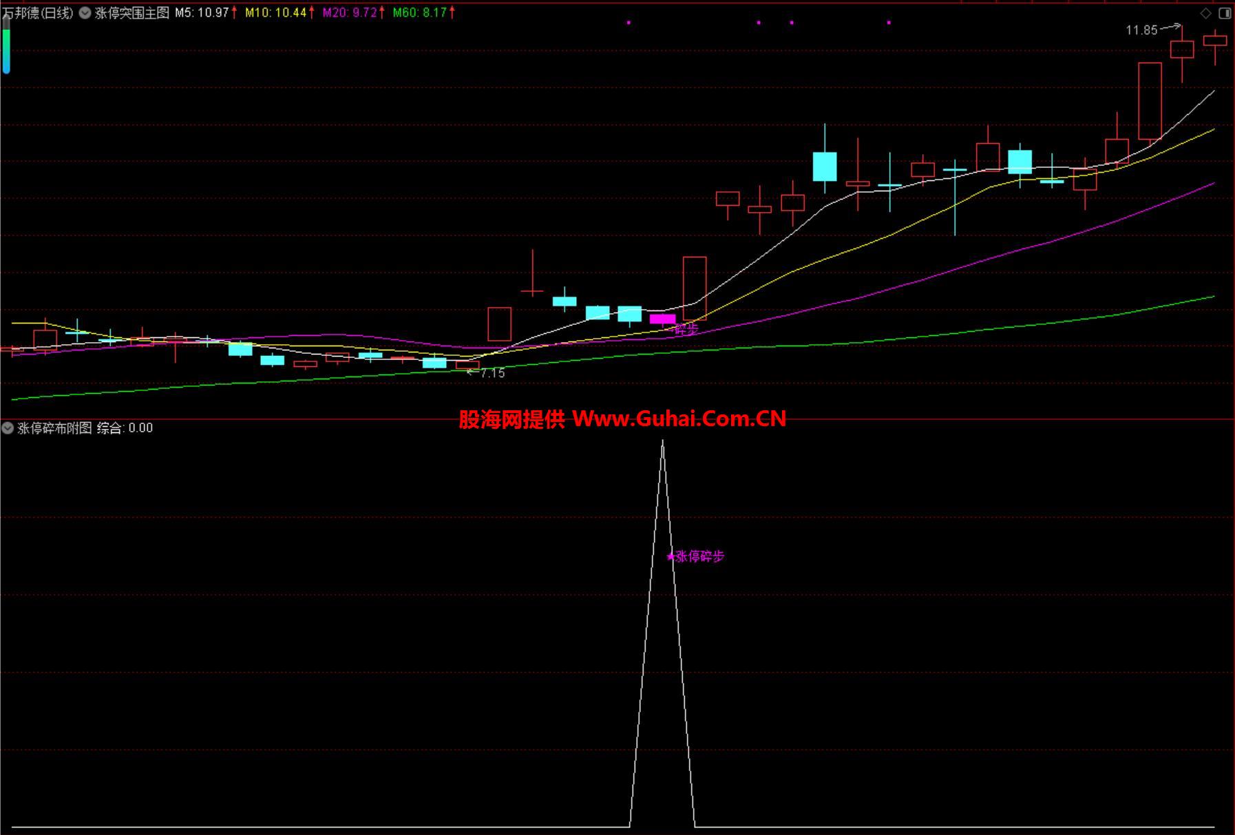 相关简介:【涨停突围碎布启动】主副图选股指标三信号均线粘合突破后的缩量再启动