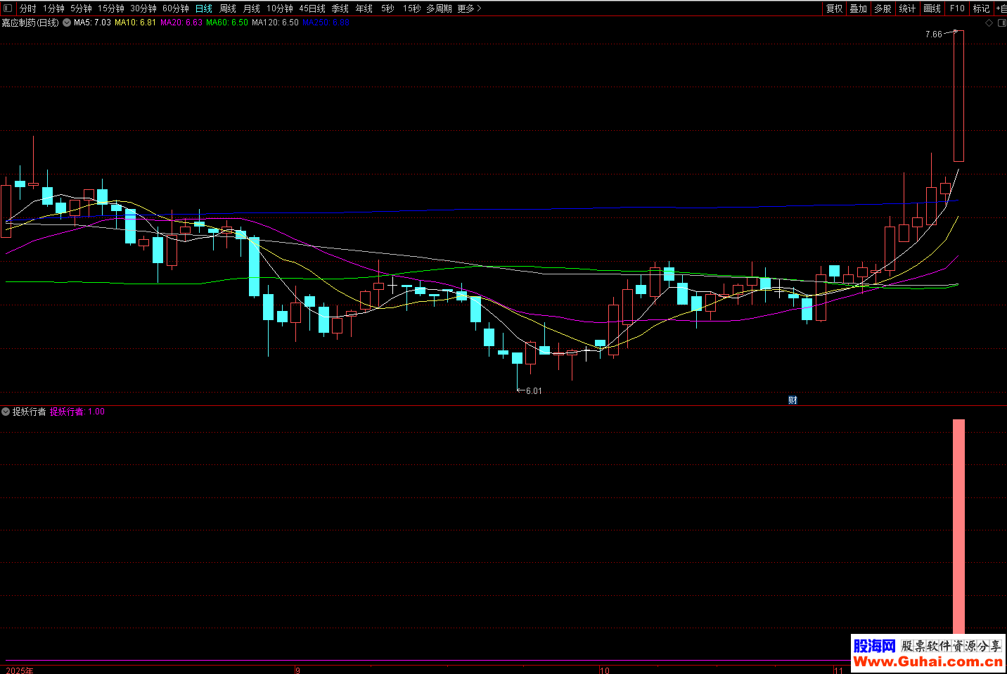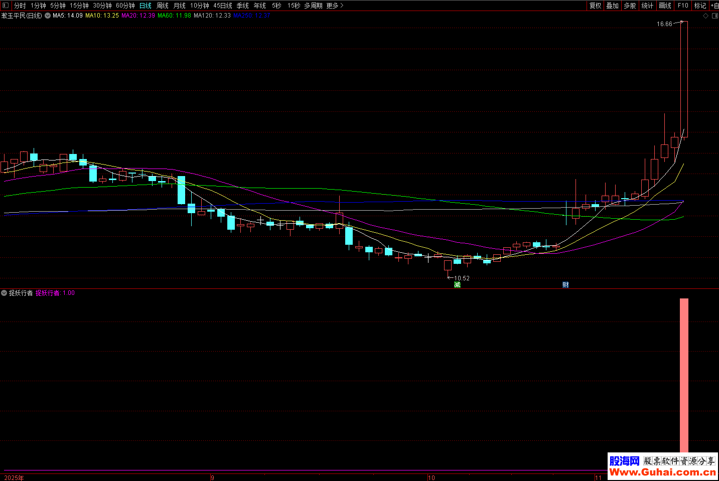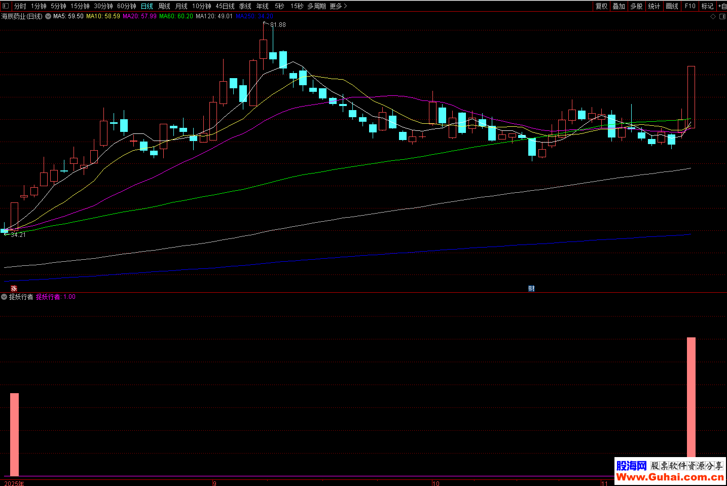 当出现"捉妖行者"信号时,图表会显示粉色柱状标识,提示投资者关注: