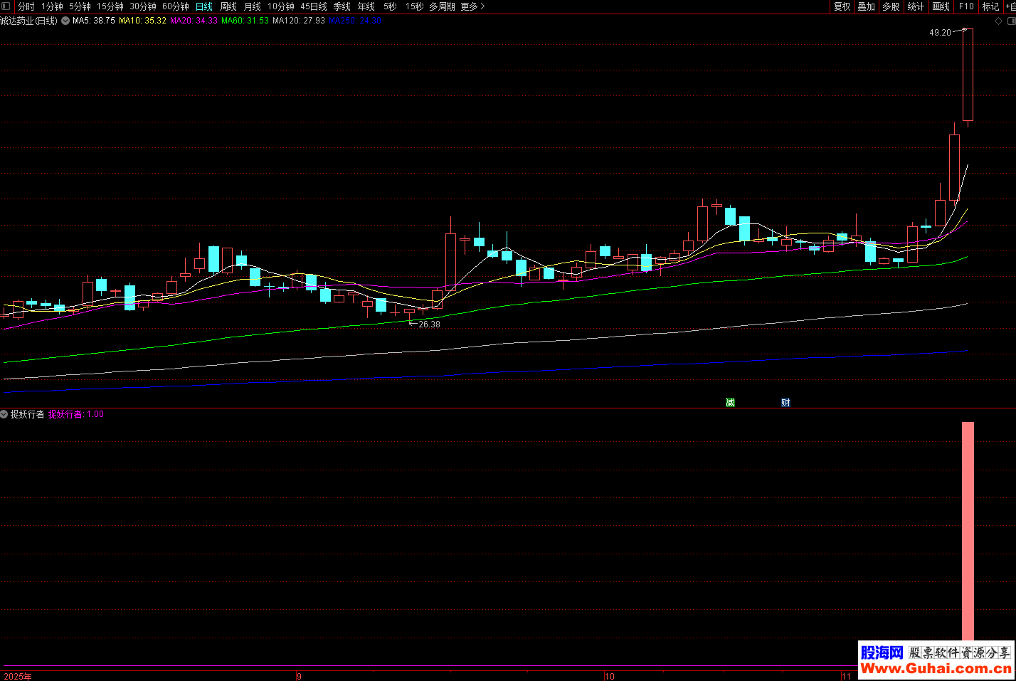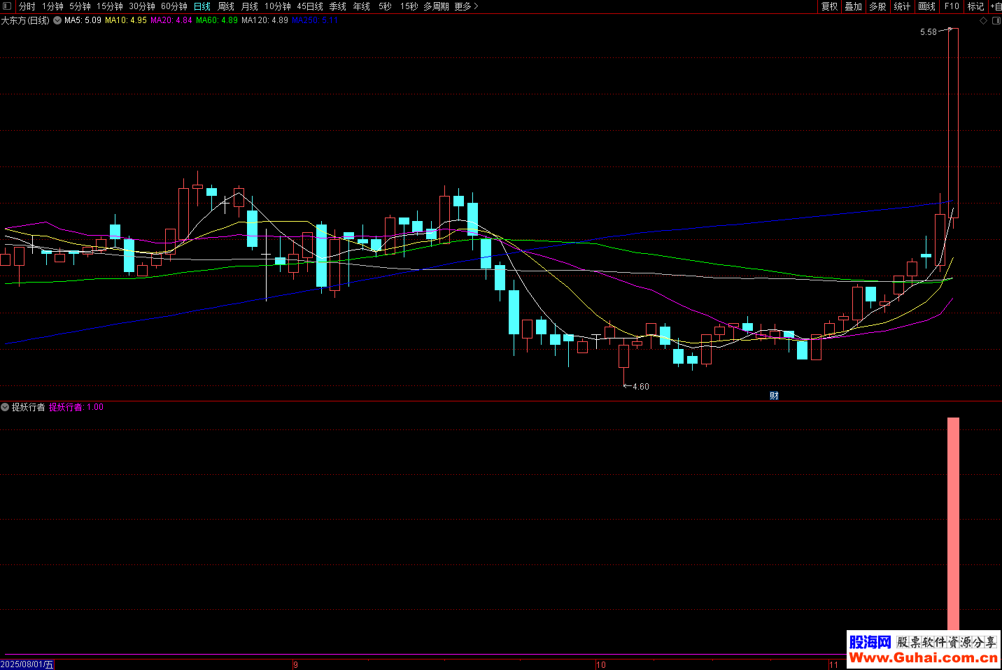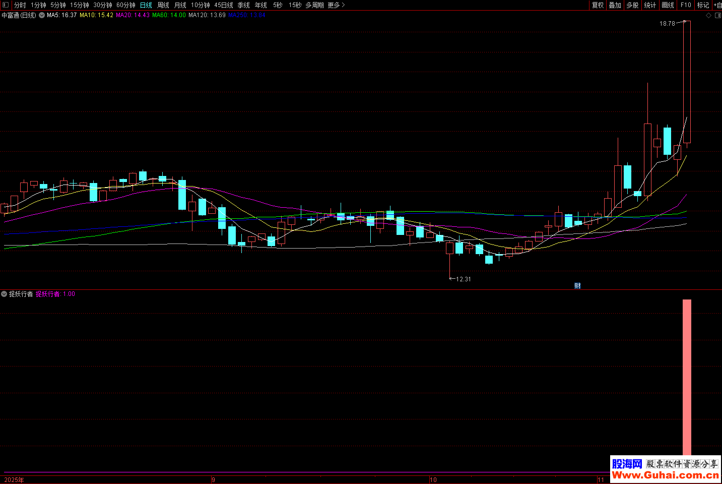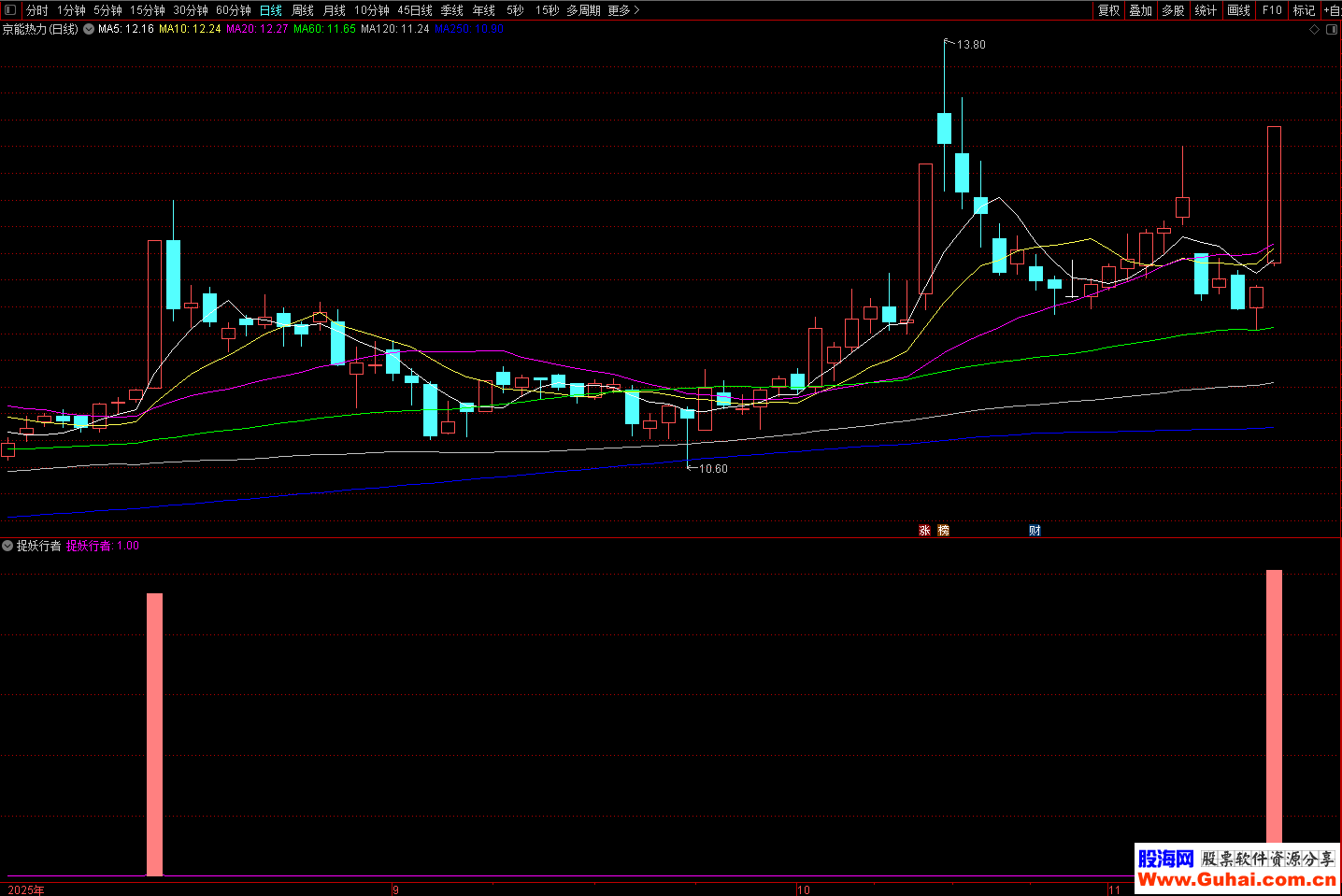 当出现"捉妖行者"信号时,图表会显示粉色柱状标识,提示投资者关注: