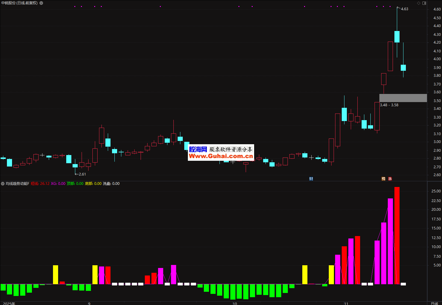 紫色信号:满足筹码集中且股价高于市场成本时,确认主力控盘;