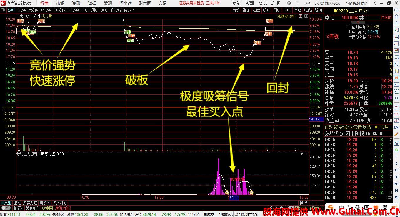 3.买入点:分时图模式下,“分时主力吸筹J”指标出现“极度吸筹”的就是最佳买入时间,而且日入拉升涨停的概率非常高;