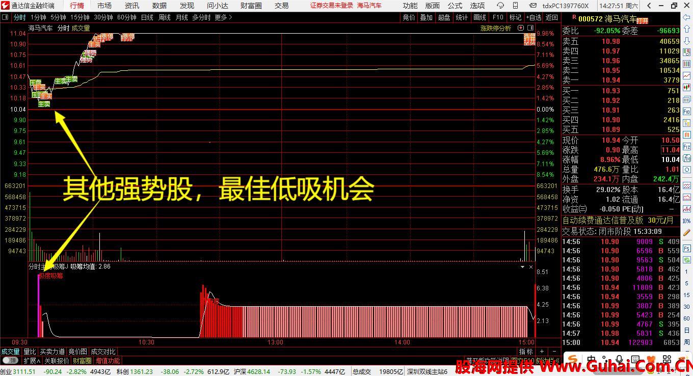 2.开盘后:用分时图观察已选出个股,快速涨停的,不用管,重点关注回落到-2%-3%之间的个股;
