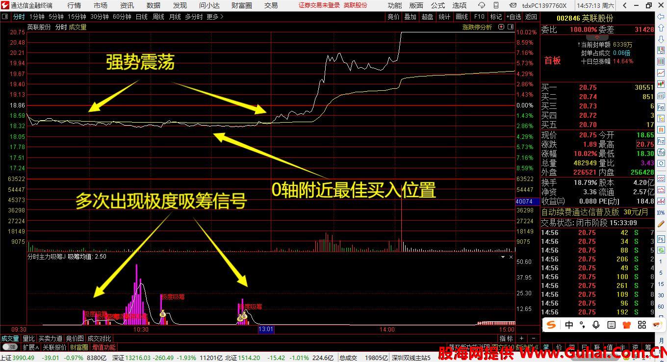 相关简介:当前交易出现典型问题 1.即便指数大跌,70家以上涨停也是家常便饭——我们需要做强势股; 2.瞬间上板的买不到,买到的多为冲高回落,日内亏损; 3.即便是买到了,而且涨停了,由于买入位置高,次日也不一定能获利出来; 4.看好个股,盘中一直在震荡,不敢下手,等你反应过来的时候,突然拉升至涨停,是否有提前的“预警”呢?