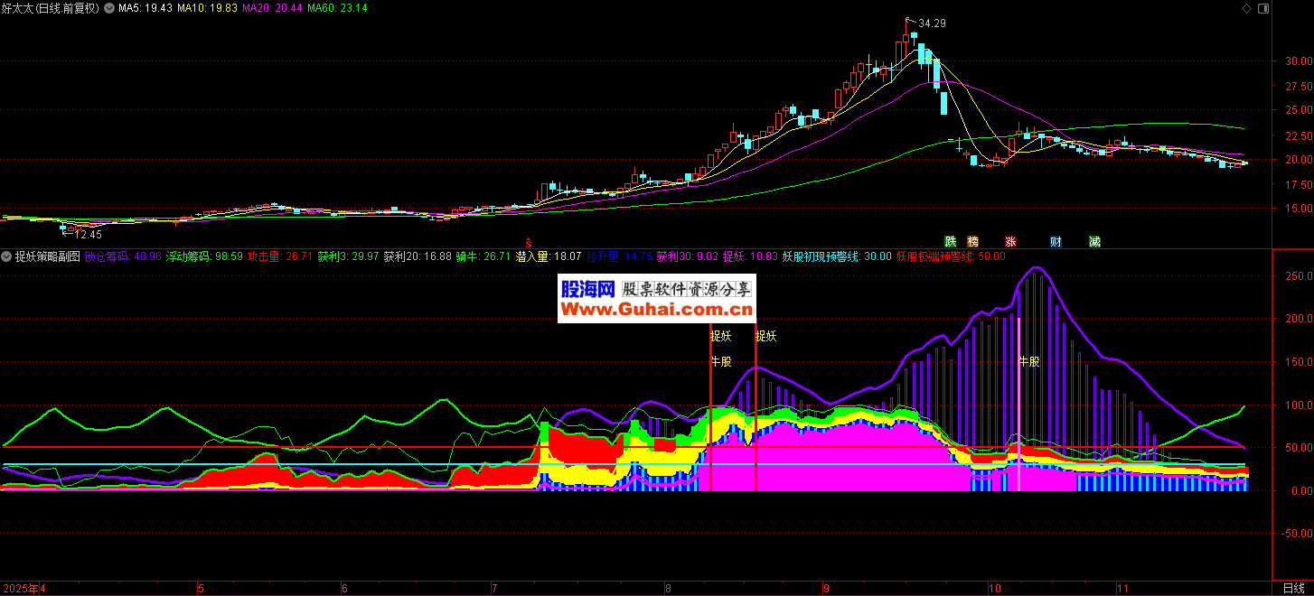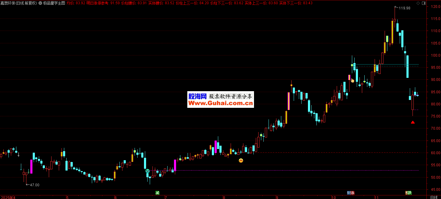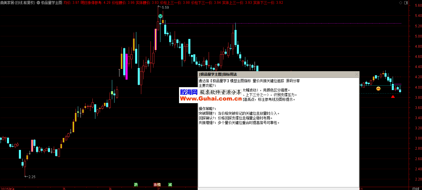 主要功能: 标记特殊K线(如跳空高开、大幅波动),用颜色区分强度。 计算K线各分段价位(如腰部、上下三分之一),识别支撑压力。 结合历史成交量极值定位关键高低点,标注参考线及图标提示。