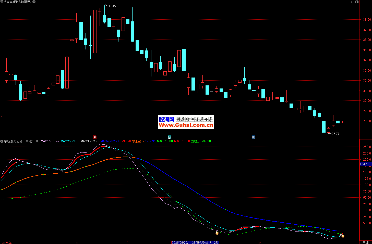 买入信号:当MACD快线上穿支撑点,且趋势线转为红色时入场