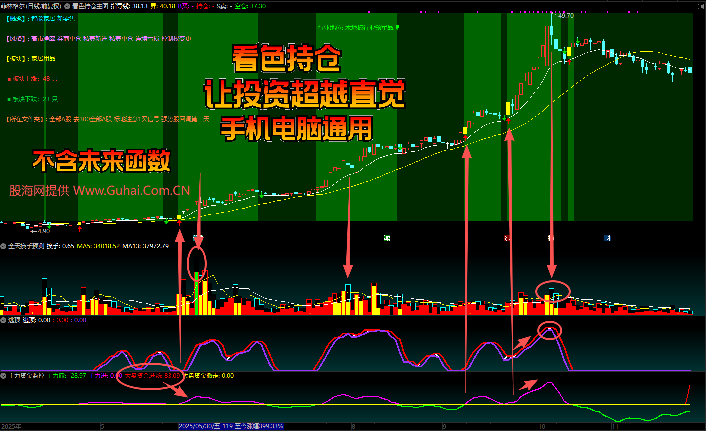 ★结合大盘资金流向,当出现特定信号时,以醒目的图标和线条提示您,不错过任何一个绝佳的交易机会。