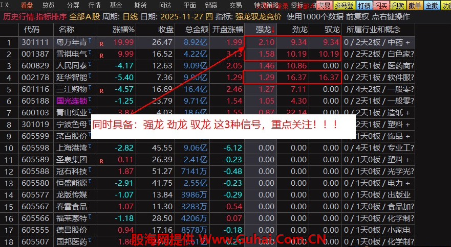再次重点:如果一个票同时具备:强龙 劲龙 驭龙 这3个信号,重点关注!!!