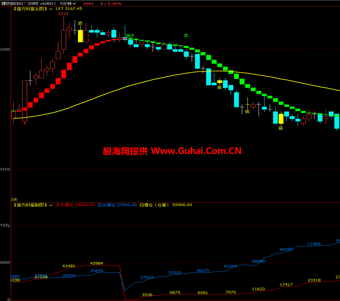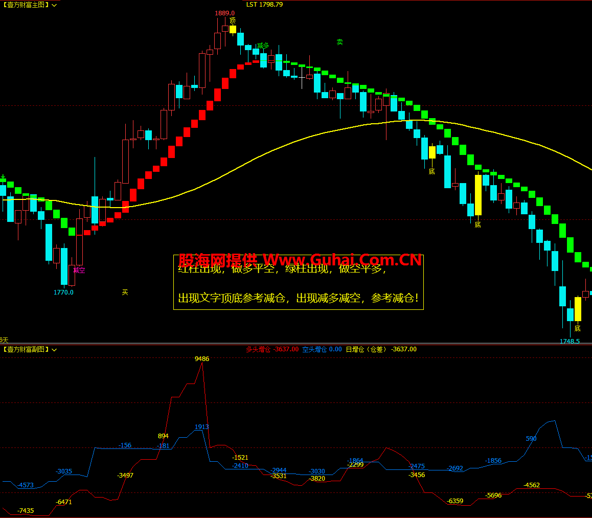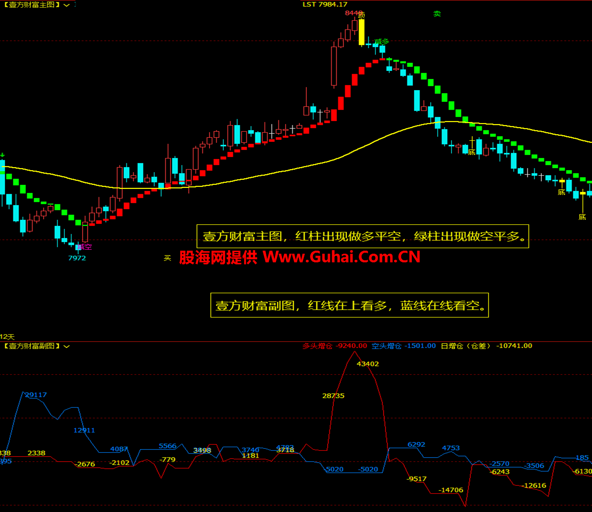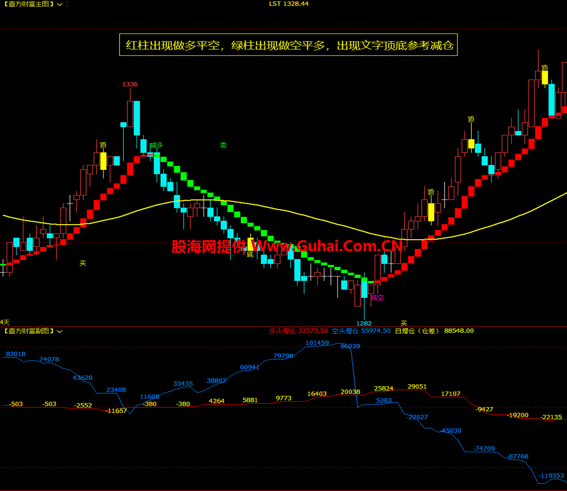 1,壹方财富主图,红柱出现做多平空,绿柱出现做空平多,出现文字顶底参考减仓,出现减多减空,参考减仓!