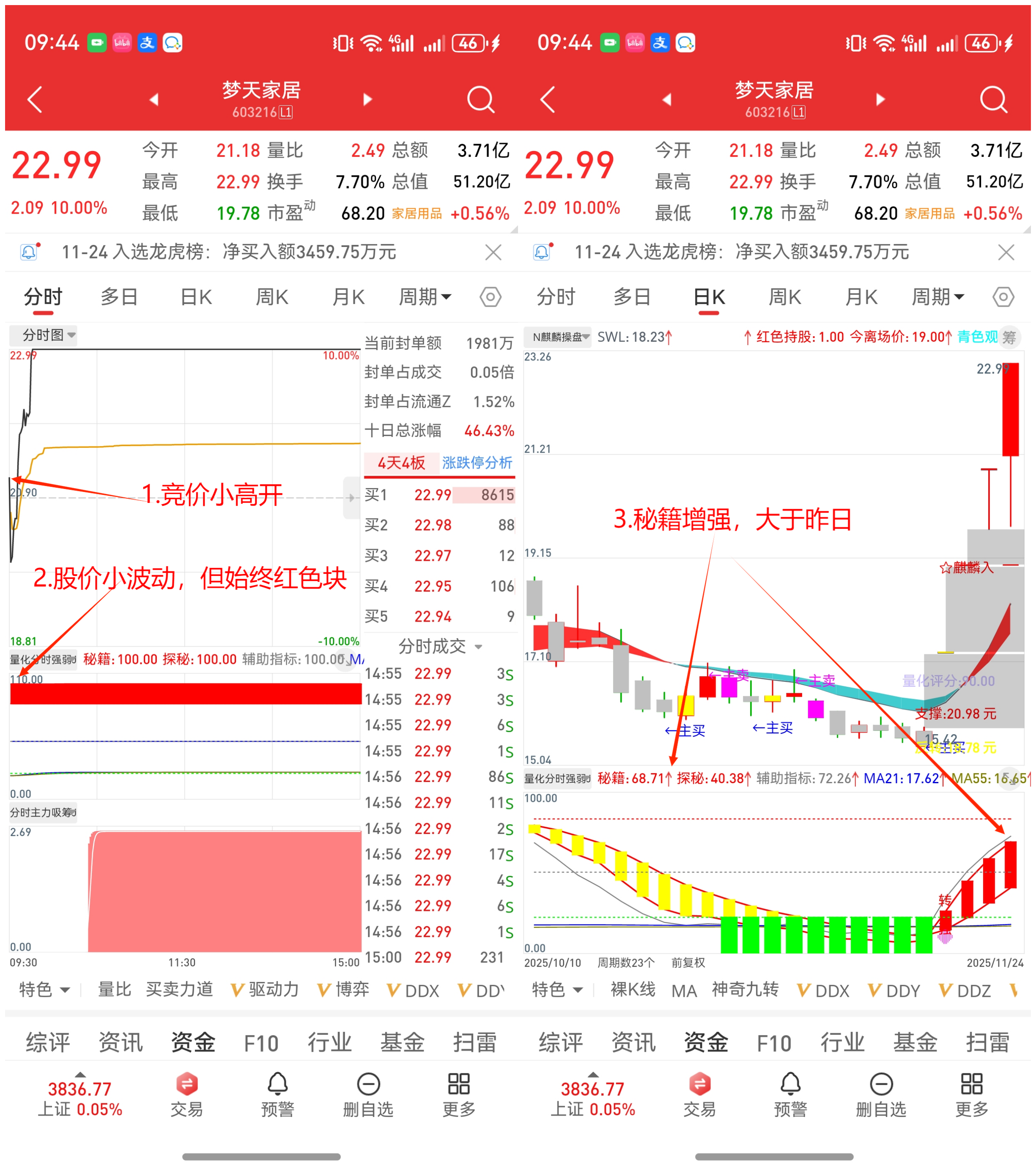 (1)竞价高开,开盘后,分时图中“量化分时强弱指标”持续出现红色块,而且“量化分时强弱指标”在日K图中,秘籍值大于昨日的(箭头向上)果断轻仓买入。