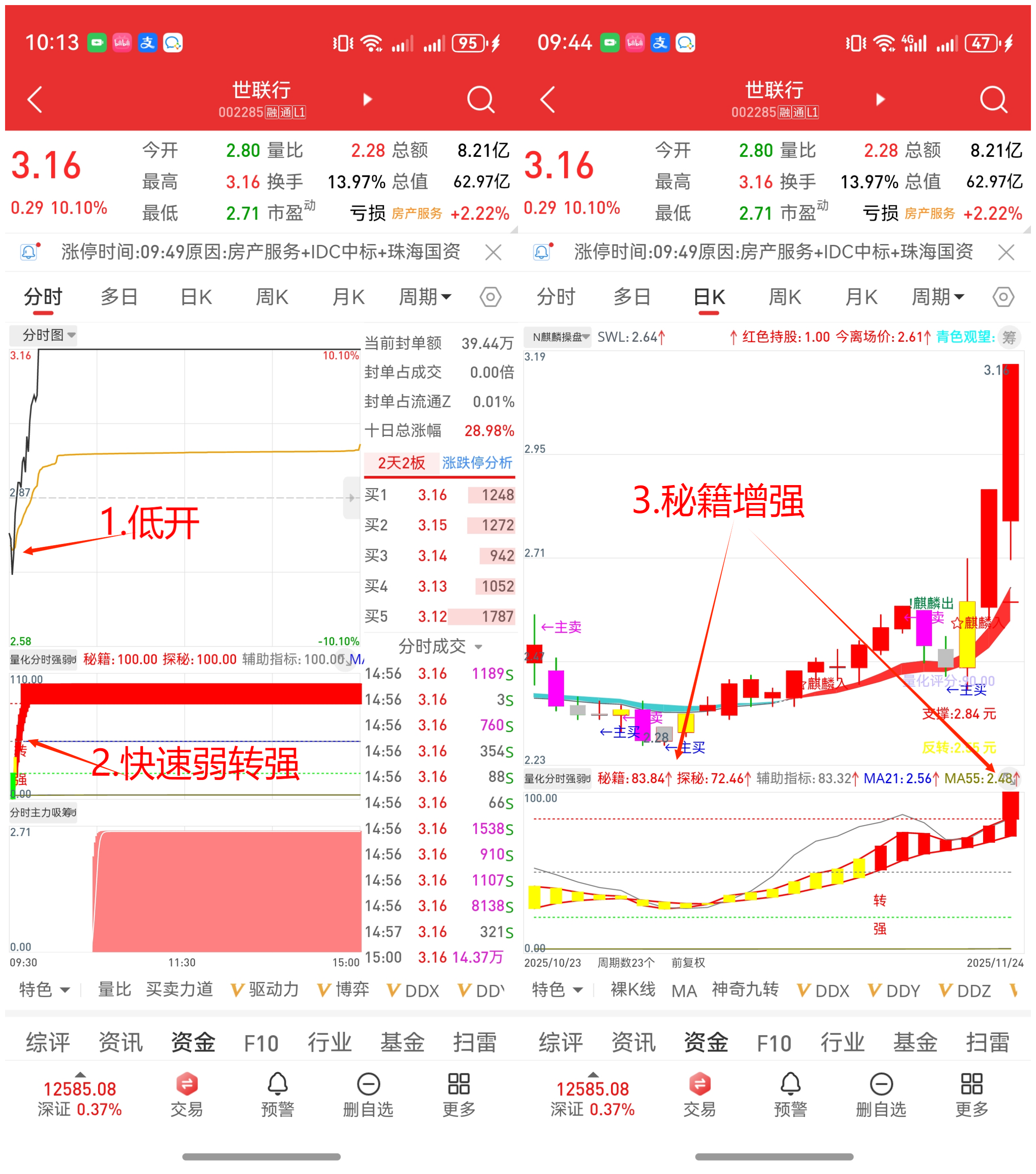 (2)低开幅度不大于4%,开盘后,分时图中“量化分时强弱指标”很快弱转强的(绿色块变红色块),而且“量化分时强弱指标”在日K图中,秘籍值大于昨日的(箭头向上)果断轻仓买入。