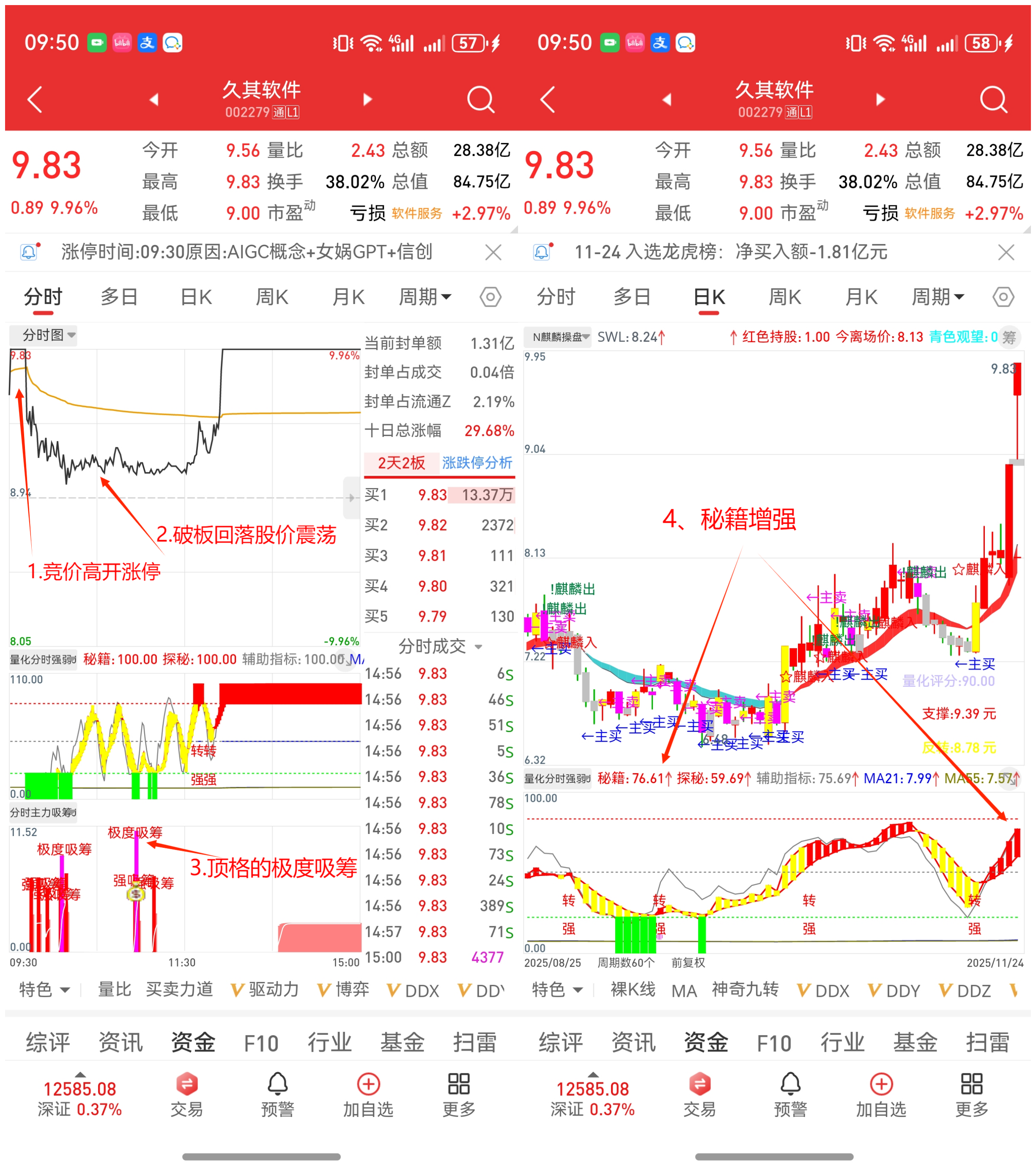 (3)竞价高开/涨停,开盘后,快速回落或破板,股价震荡,分时图中“分时主力吸筹指标”出现“极度吸筹”而且“顶格”,在日K图中,秘籍值大于昨日的(箭头向上)果断轻仓买入,而且是最佳买入时间。