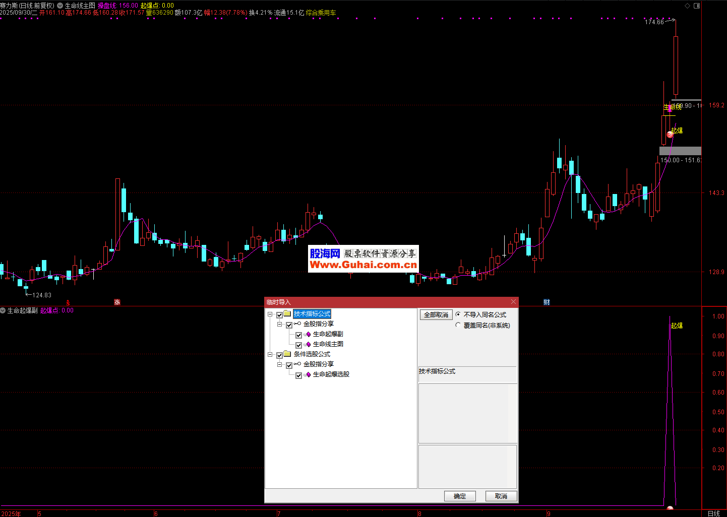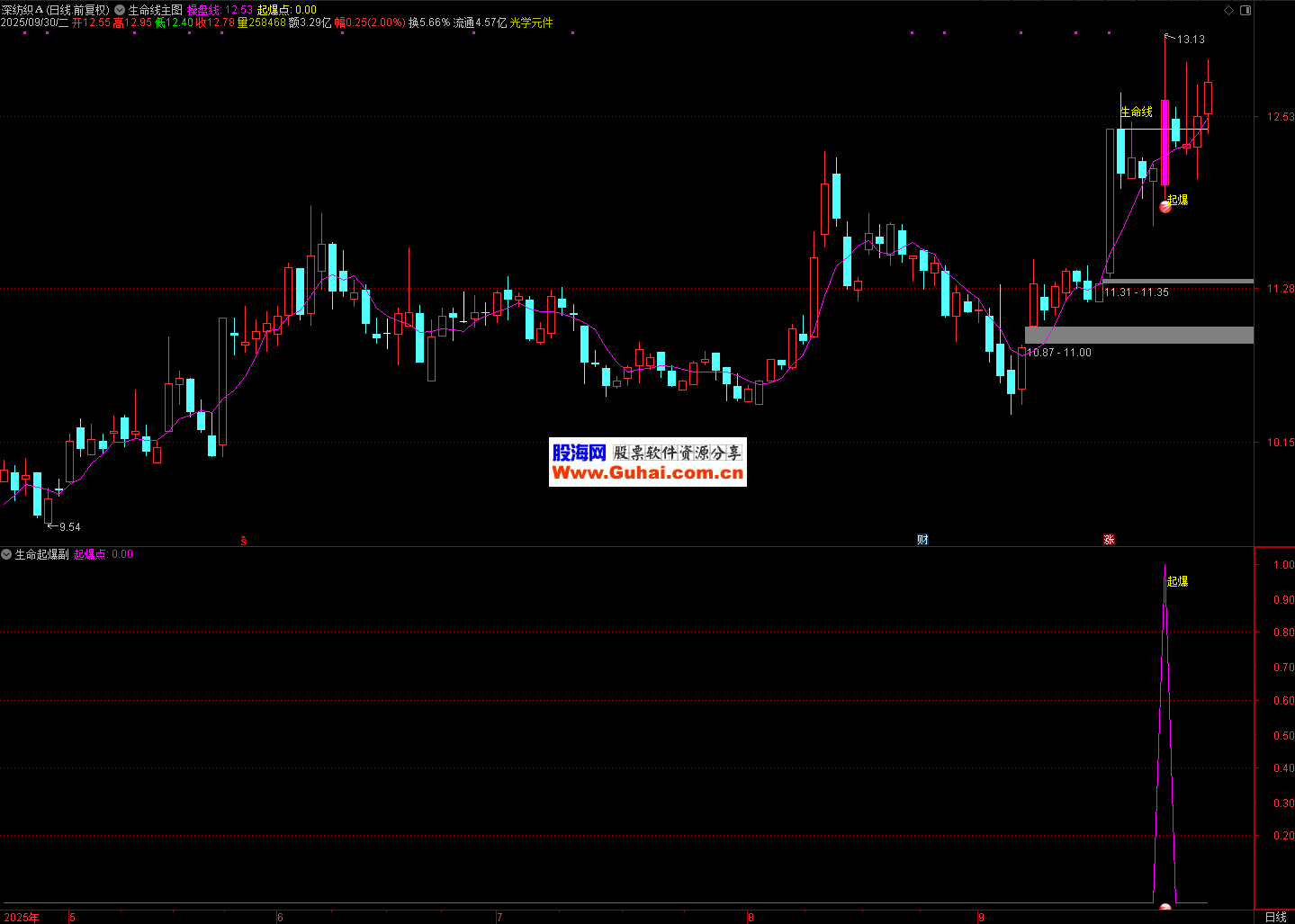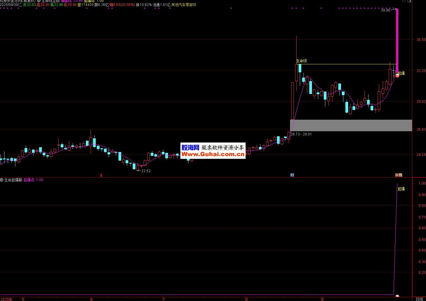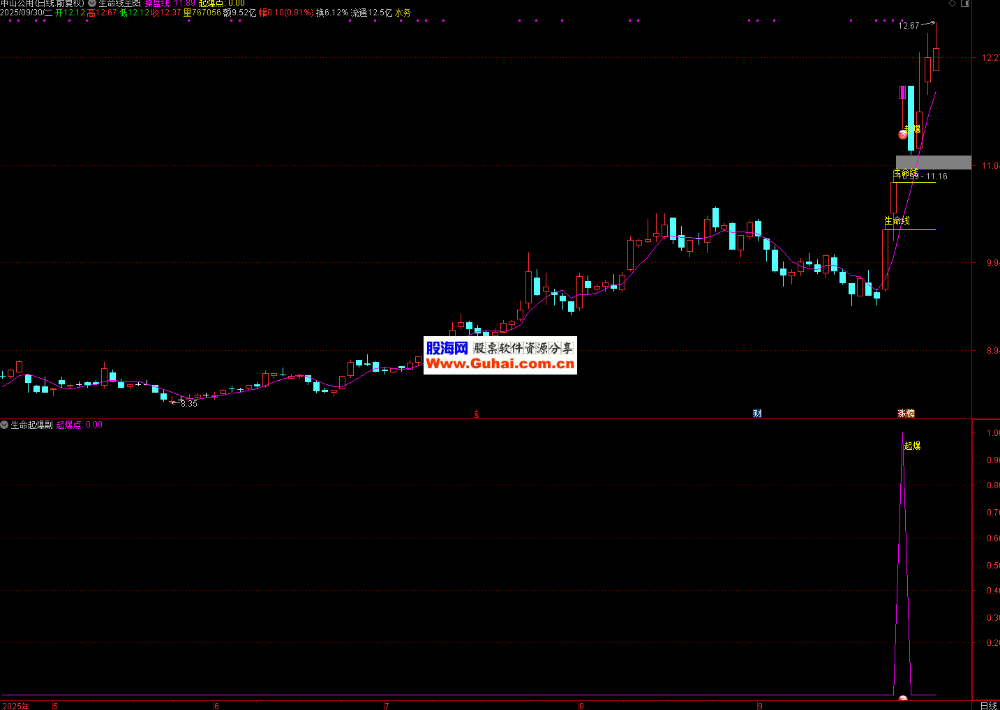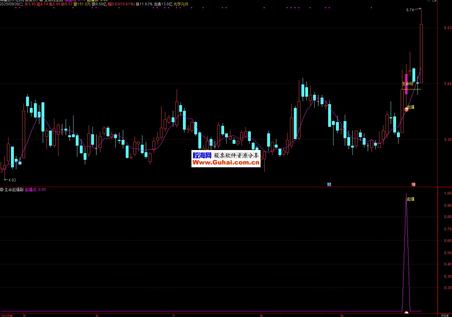 起爆点:当股价突破生命线且满足30日内有过放量信号、5日新高、涨幅未超20%等条件时,触发紫色柱状标记和文字提示。