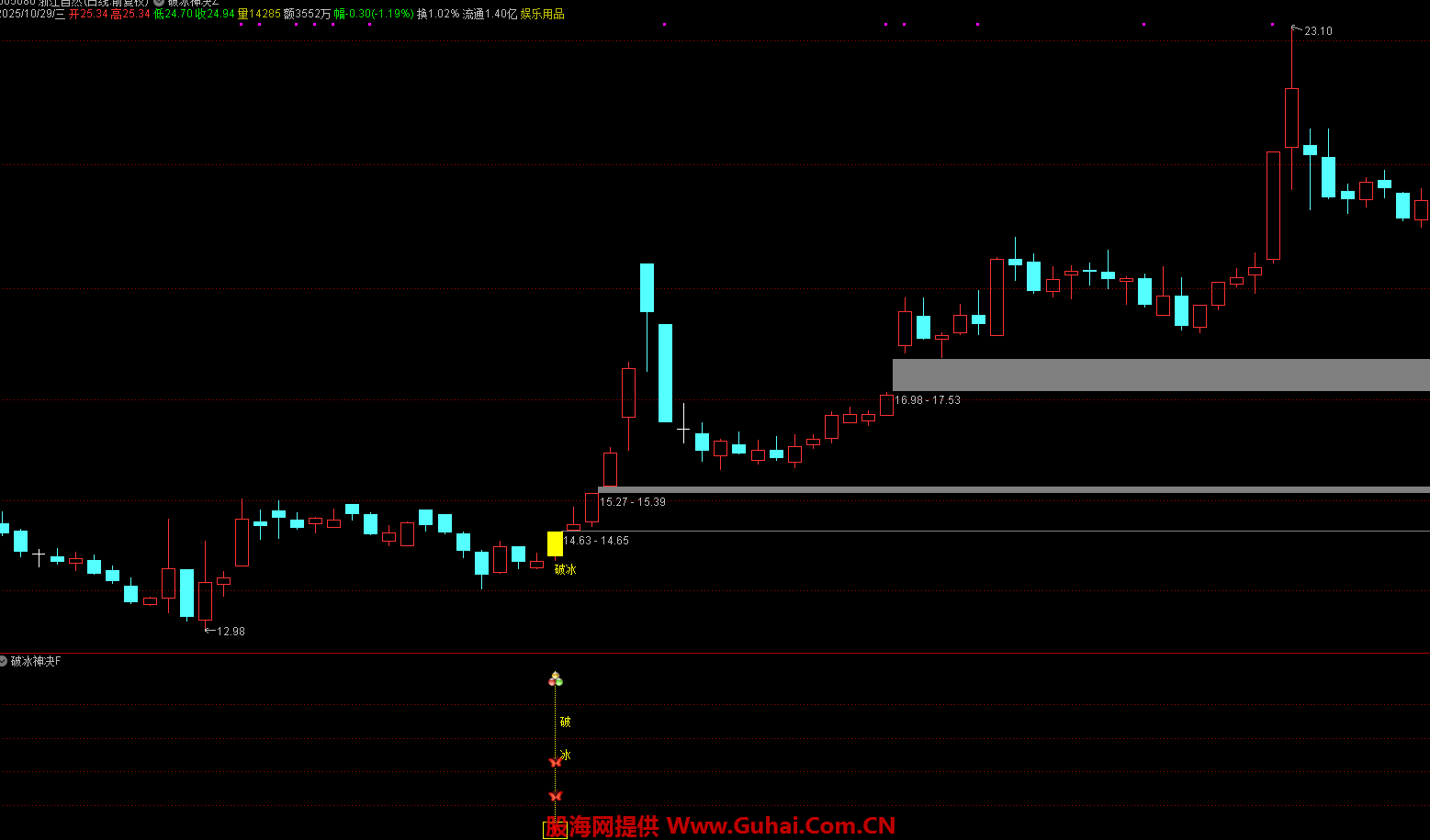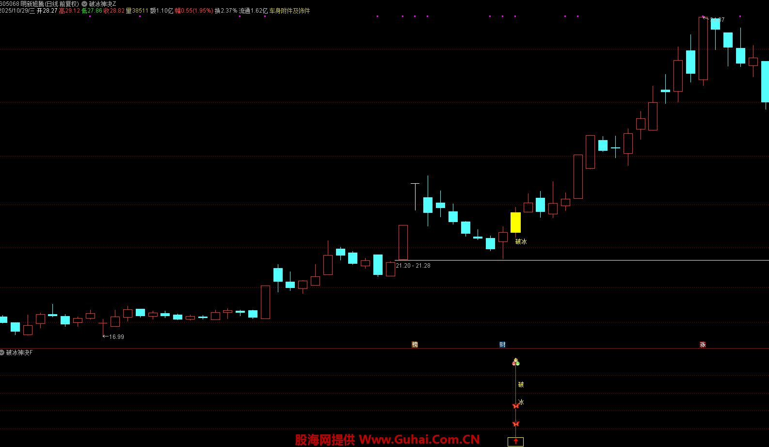 指标主要用于识别股价突破特定压力位的买入信号。它通过计算价格的平均值和动态波动通道,当收盘价突破上轨且满足连续上涨、涨幅适中、前一日收阳等多重条件时,触发黄色柱状图和图标提示的买入信号。