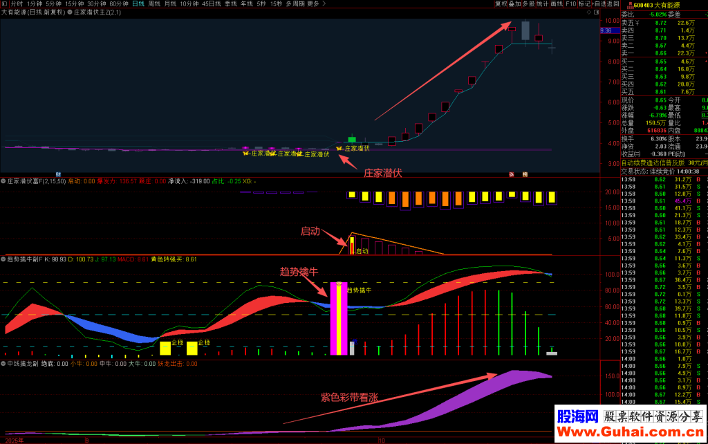 2、启动信号出现后,观察爆发力强度,爆发力黄色时强势,粉色减弱,紫色弱势