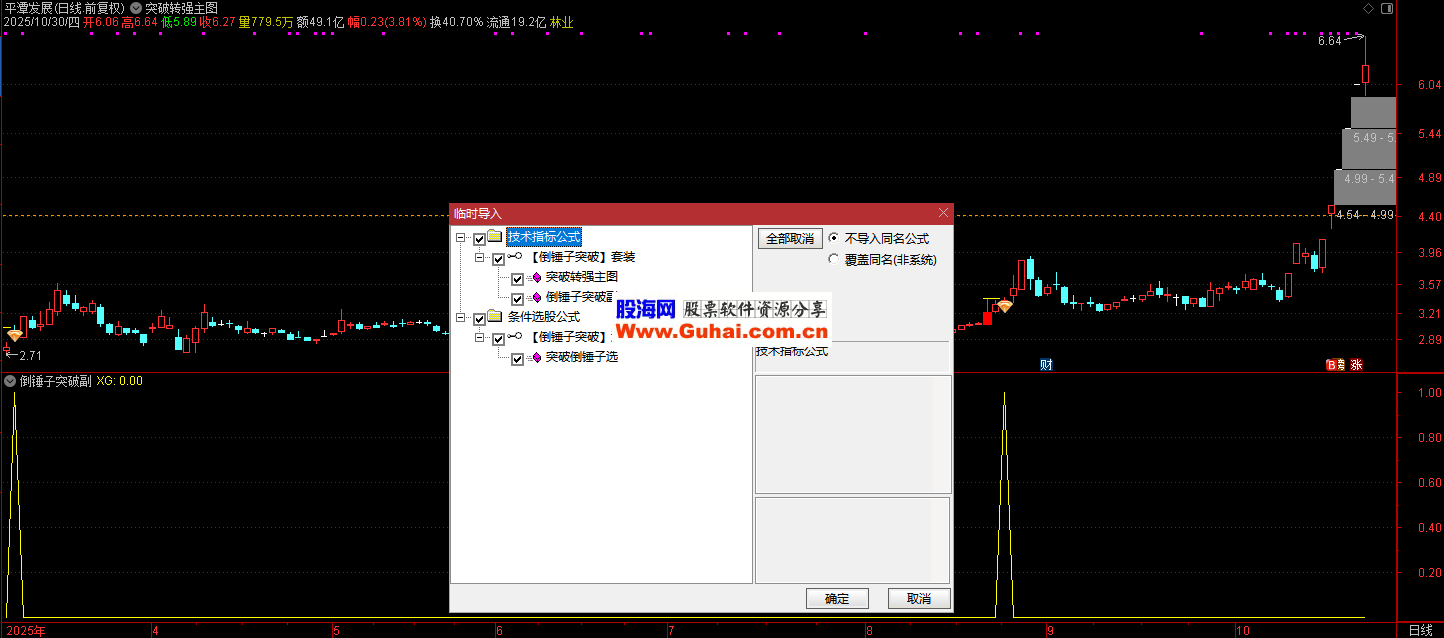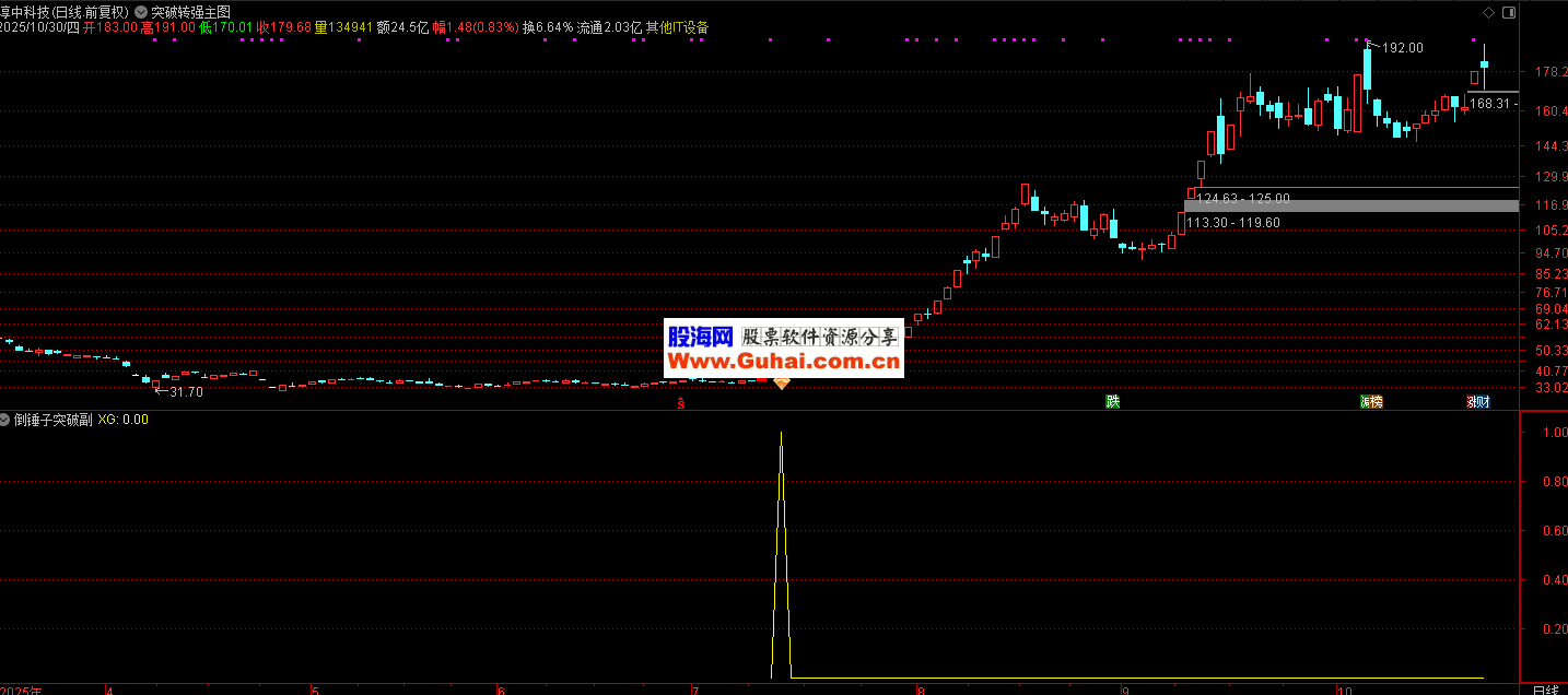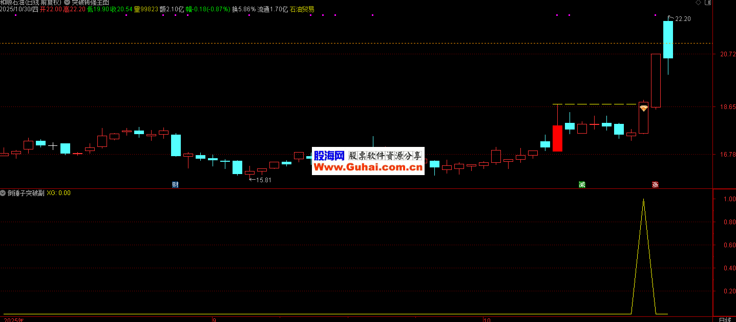 当天阳,前期一月内没有大幅度上张,当天突破前期倒垂字K线,本指标可设置预警使用。