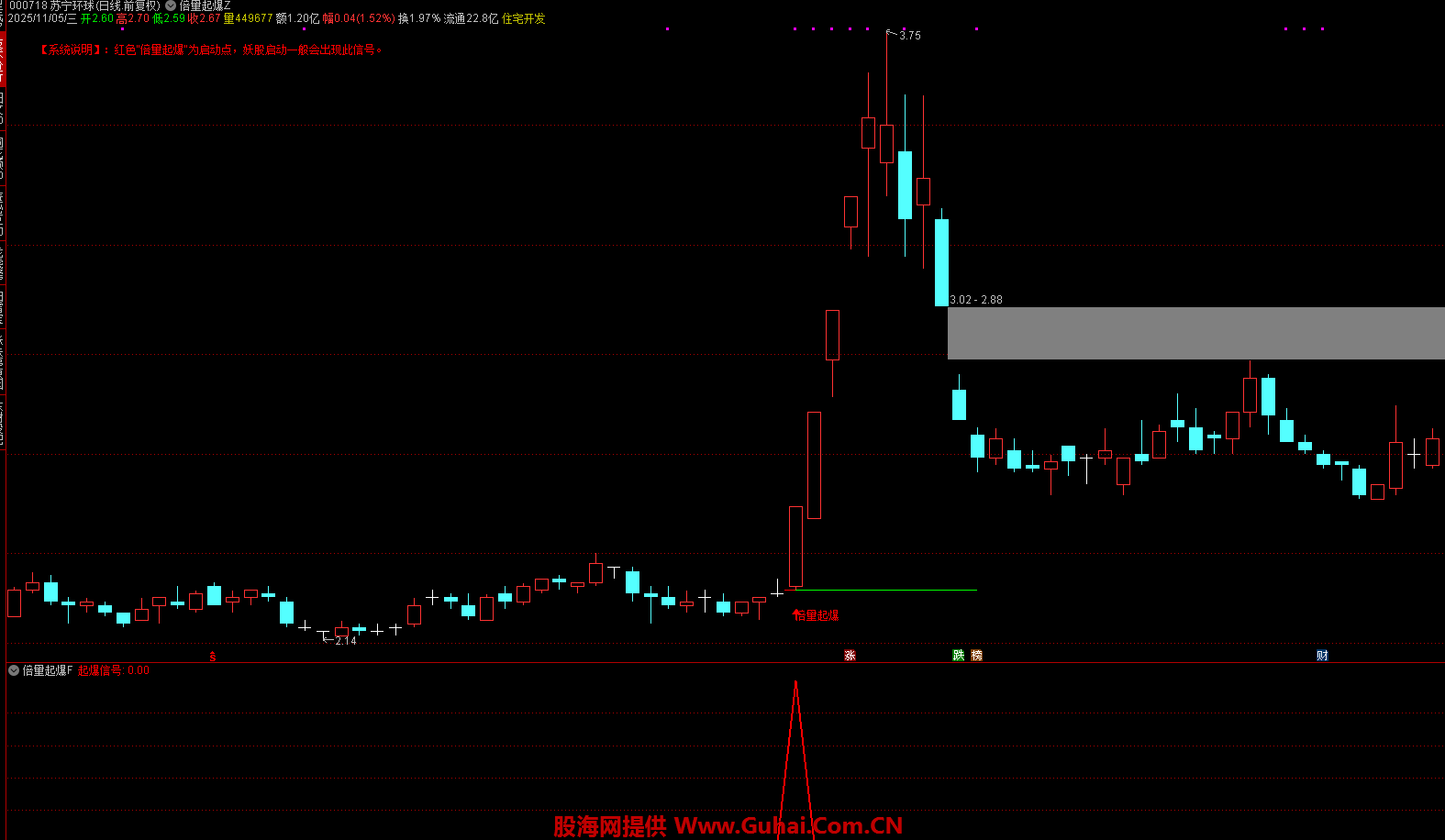 1. 当出现符合条件的“倍量起爆阳线”时,K线下方会出现一个“箭头”买入图标。