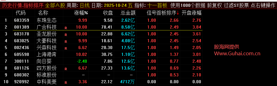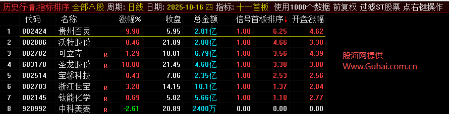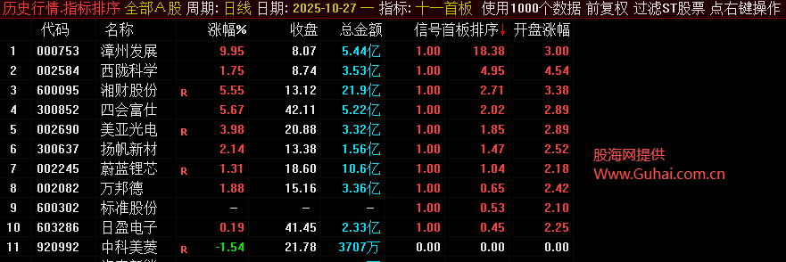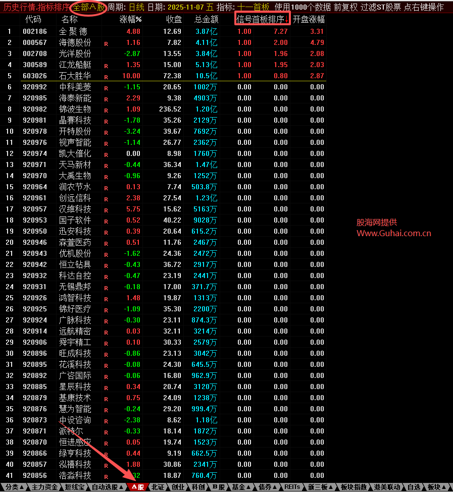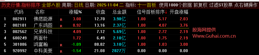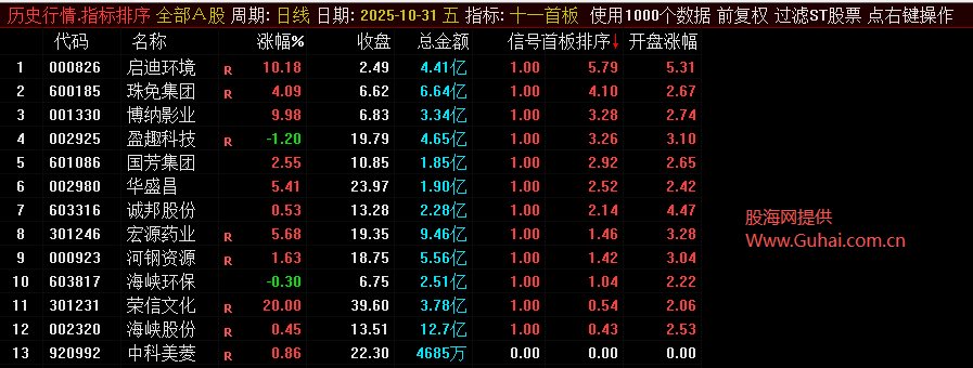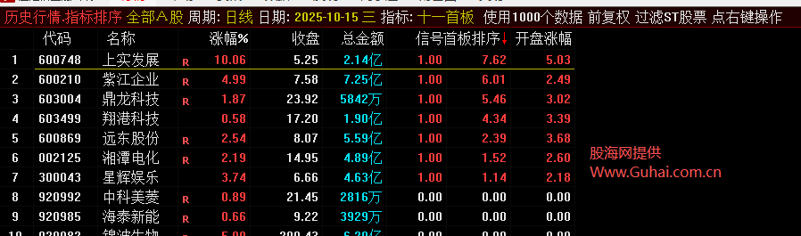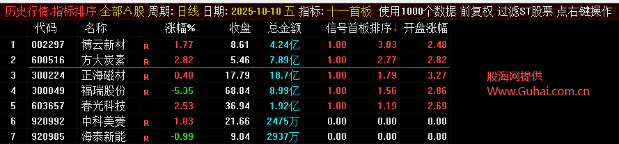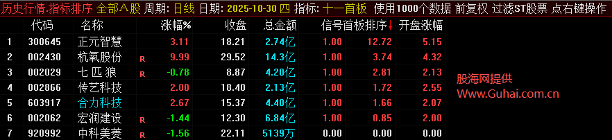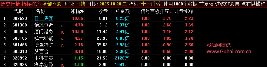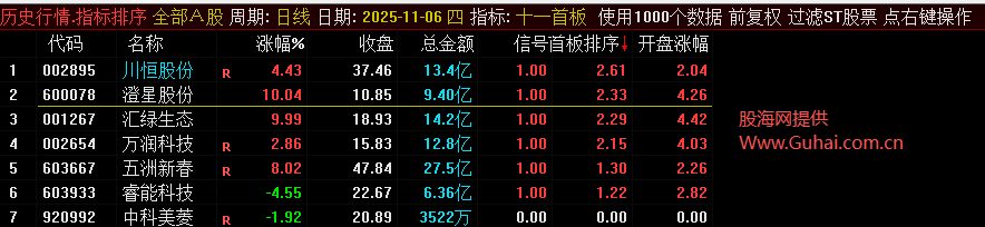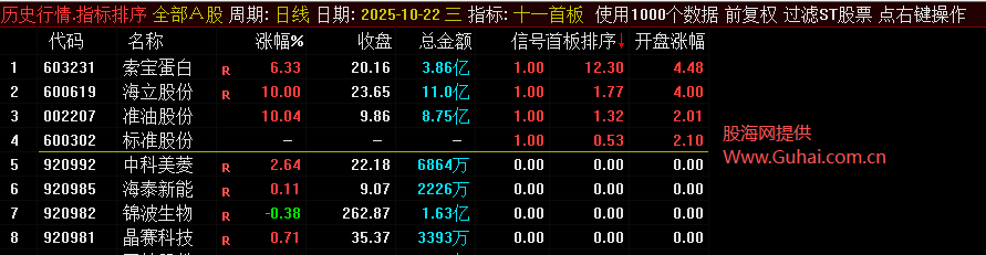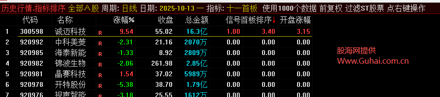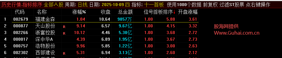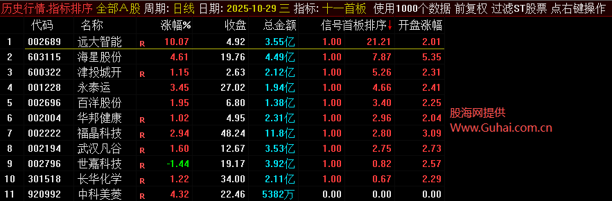 3. 排序结果生成后,点击“首板排序”,按数值从大到小排列,一般情况下优先关注前两个,时间充裕可查看剩余的。例如今天的前两个没涨停,反而是有数值的最后一个“石大”涨停了。
