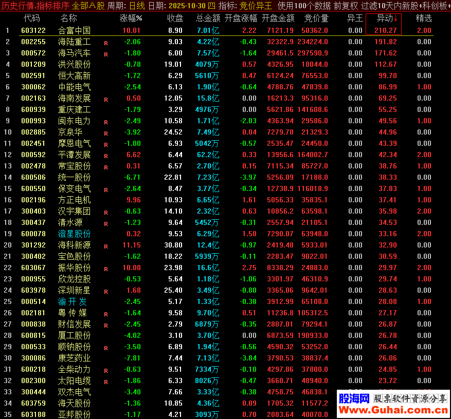 初步扫描: 开盘后,首先利用“异动”指标排序,快速锁定资金关注度高的股票池。