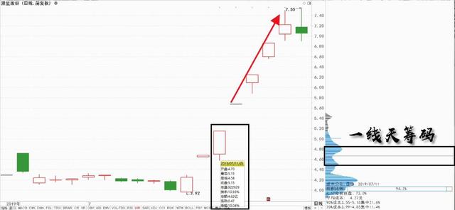 一线天是一种非常极端的筹码高度集中、应该说是极度集中,在一个看似很均匀的,或者很错乱的筹码的分布当中,突然在某一天出现了一根线单封,它不是单封了是一根线直接顶格的筹码,这个时候通常伴随着一字板,或者T字板这种缩量的涨停板,这个时候通常在后面会有比较大的涨幅,这是一线天筹码的原理。我们看到最近有很多频繁地出现一线天筹码,这也是今年以来的一个特色,特别是下半年,我们今天说三种一线天常见的情况。第一种情况是低位,在三板或者四板以下,特别是三板以下,两板、三板这个位置比较常见的T字板或者一字板或者是秒板,我们把它定义为抢筹。主力在这个地方不计代价地抢筹,另外像前期的华为汽车的东风科技这只龙头股也是,开始抢筹在三板的时候表现得非常明显,筹码高度集中突然之间出现一线天筹码,就是很突然不是说前面就有准备,然后上下两方的筹码,你会看到突然减少了很多,然后中间突然出现一个一根一线天,这是典型的筹码向中间聚拢的一种效果。
