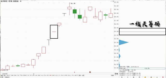 还有一个就是高位、中高位的一线天,这种情况不是非常多见,通常在行情比较好的时候出现,这个时候是属于典型空中加油去造妖了,主力在高位去接盘也是不惜代价。比如欣天科技300615,我们看到在五板这个位置的时候,那么高的位置居然也能够出现一线天,下方已经付出很多,却在五板的位置突然能够一线天,这是明显集中拿货。