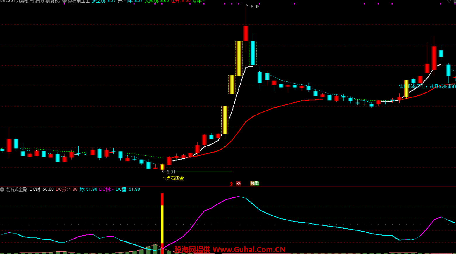 4、长线:选出一段时间内的信号加入自选,结合主图划线以大视距、广视野角度观察是否有强势超越信号高点图形出现。