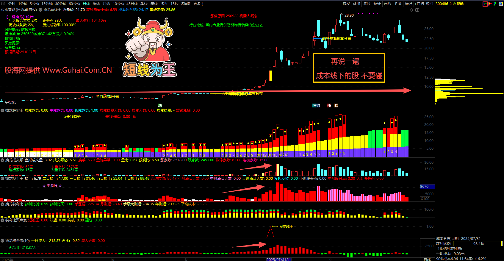 1、指标含有【FINANCE-流通市值、COST-成本分布、CAPITAL-流通股本、WINNER-获利盘、CURRBARSCOUNT 只用于书写文字】函数,介意者请勿下载。