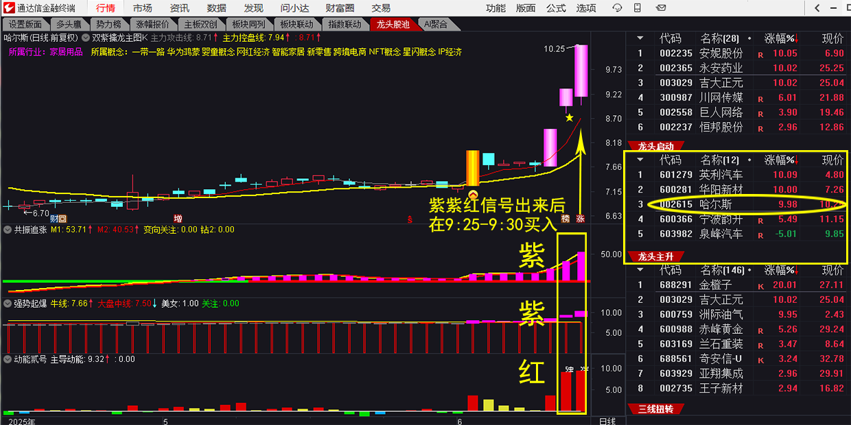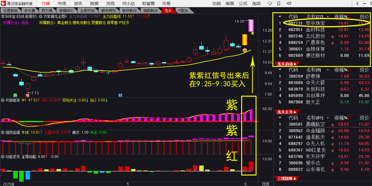 1.当日9:25用通达信软件一键选出满足六维共振(紫紫红)的个股龙头启动、龙头主升等多个股池同步更新完成;
