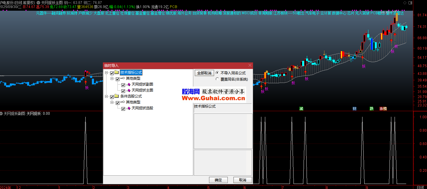通达信天网捉妖指标公式是一个综合性技术分析指标,主要用于识别 “妖股” 特征信号,并结合 K 线趋势、成交量、持仓状态等信息,辅助判断个股买卖时机和趋势强弱。