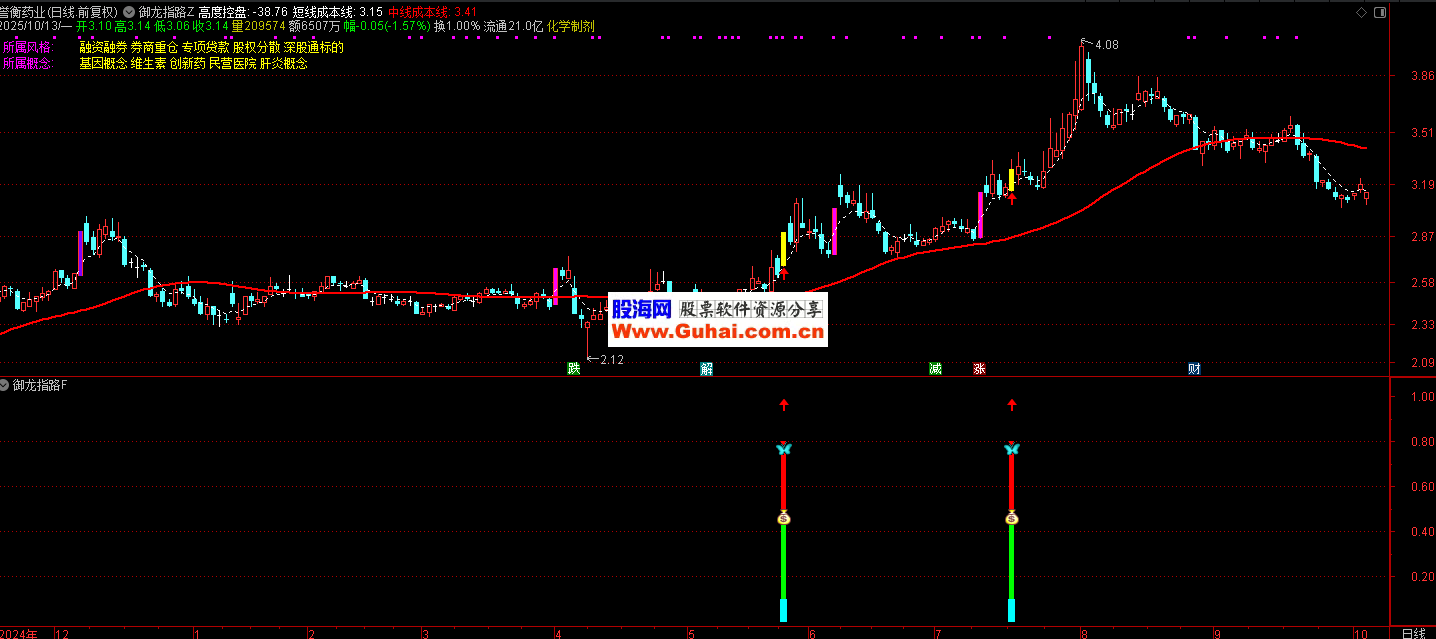 使用策略: 买入时机:主图出现“御龙”紫色柱或副图出现红绿青三色信号柱时介入;