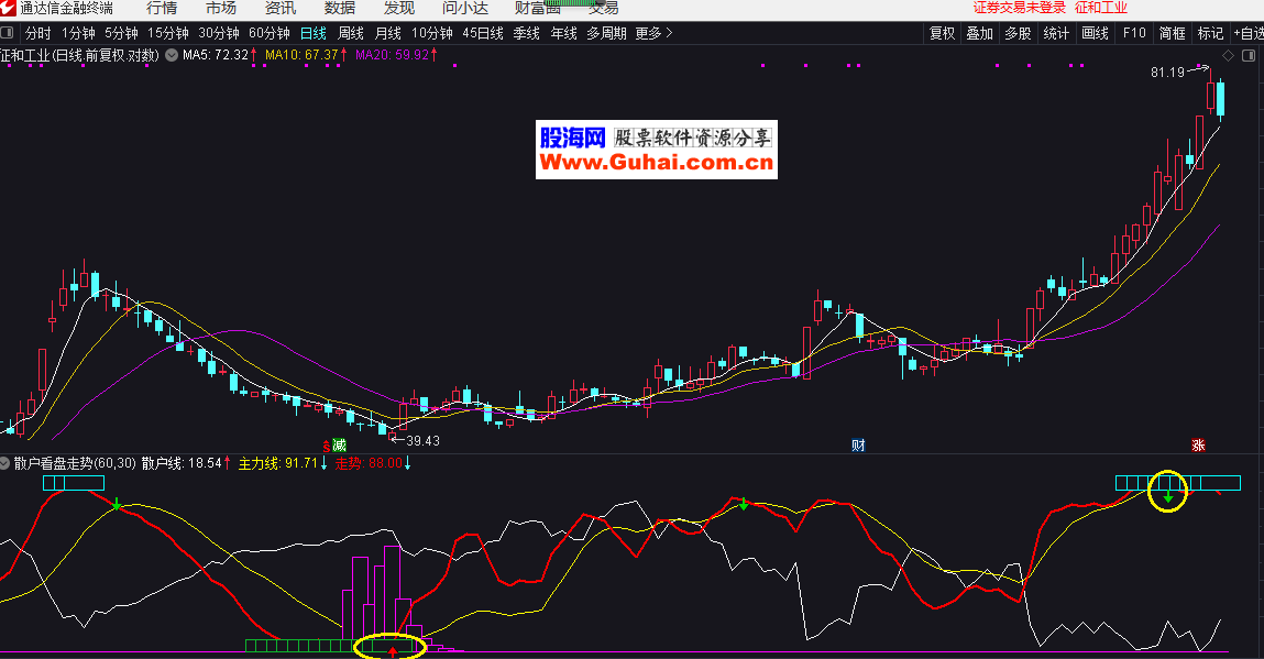 2.卖点:散户看盘走势副图指标高位发出绿色箭头时可分批卖出;