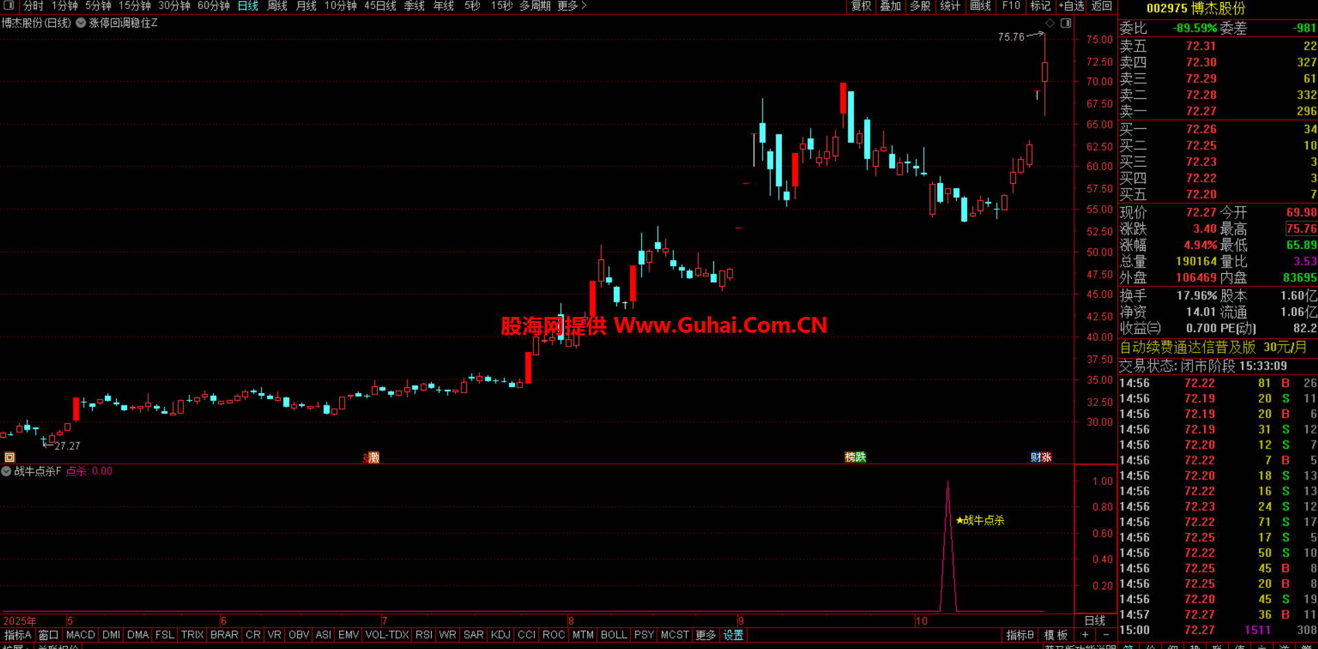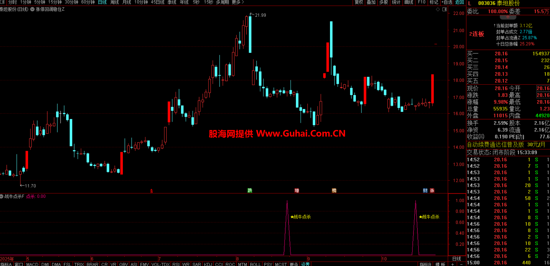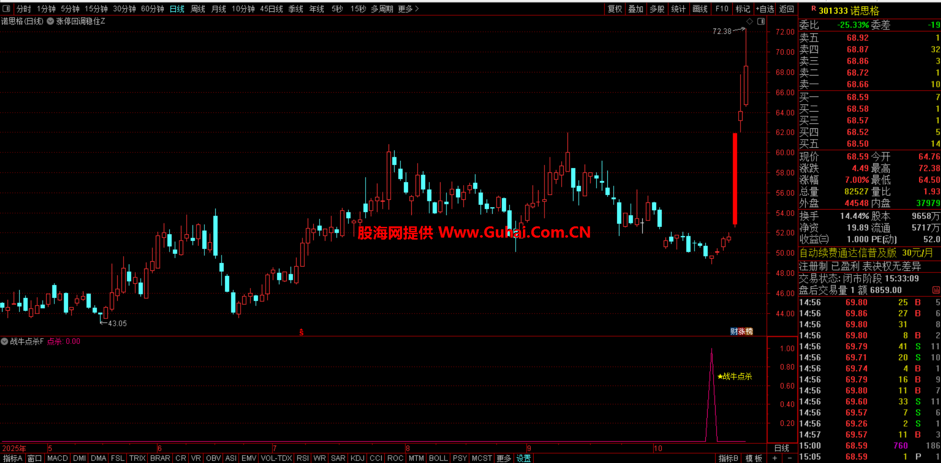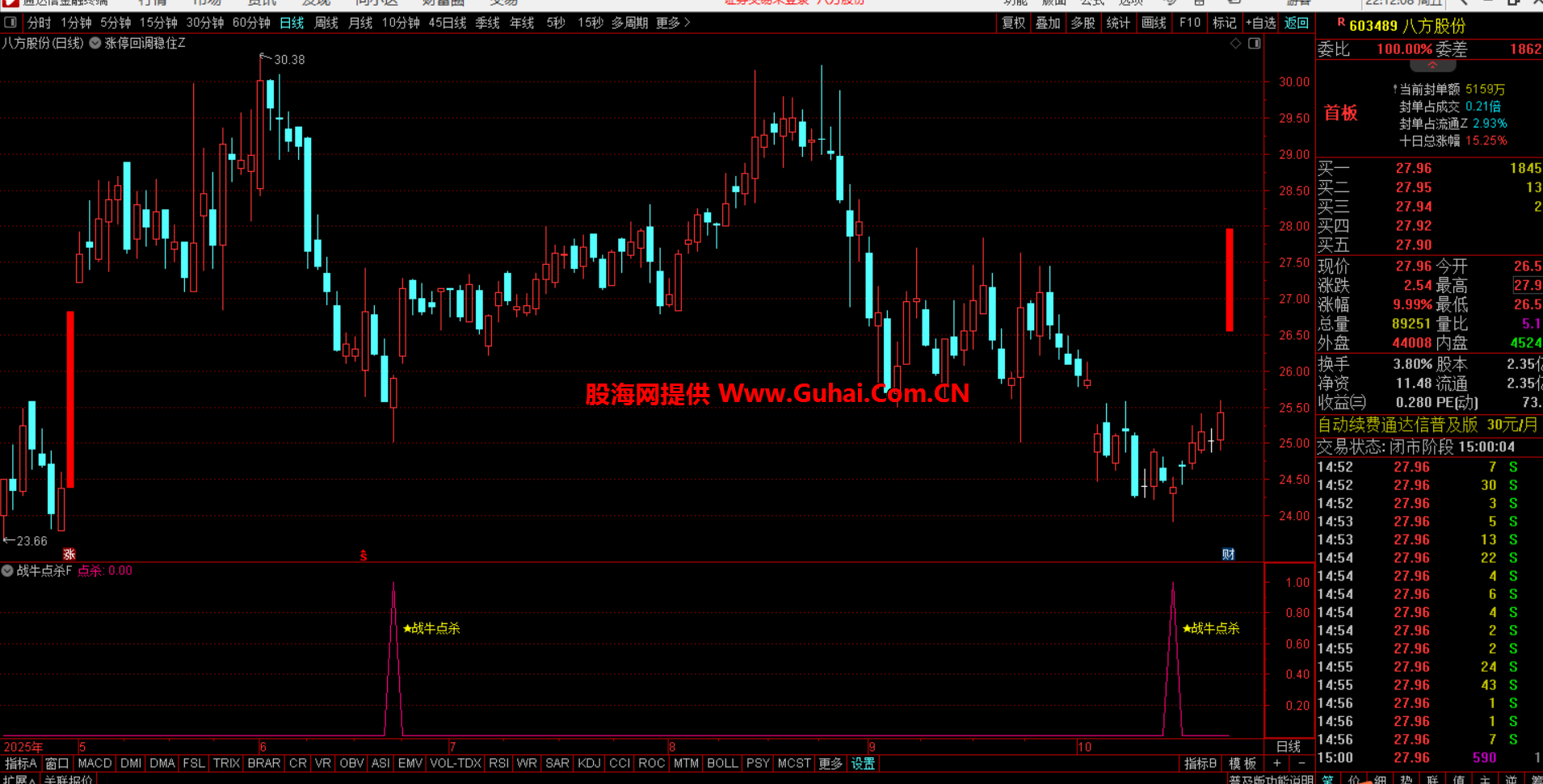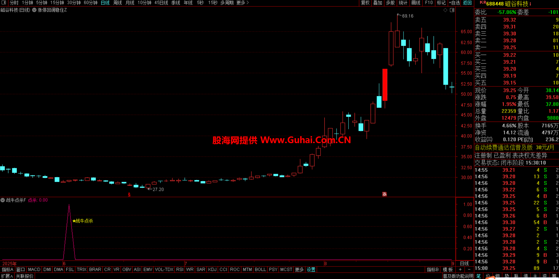 它通过计算9日内的相对强弱指标(RSI),结合价格波动和均线偏离度,识别短期超卖后的反转机会。当短期RSI快速上穿中期RSI,且出现长下影线、收盘价低于30日均线3%以上时,触发"点杀"信号,提示可能迎来反弹。操作上可在信号出现后轻仓试多,止损设在前低下方。
