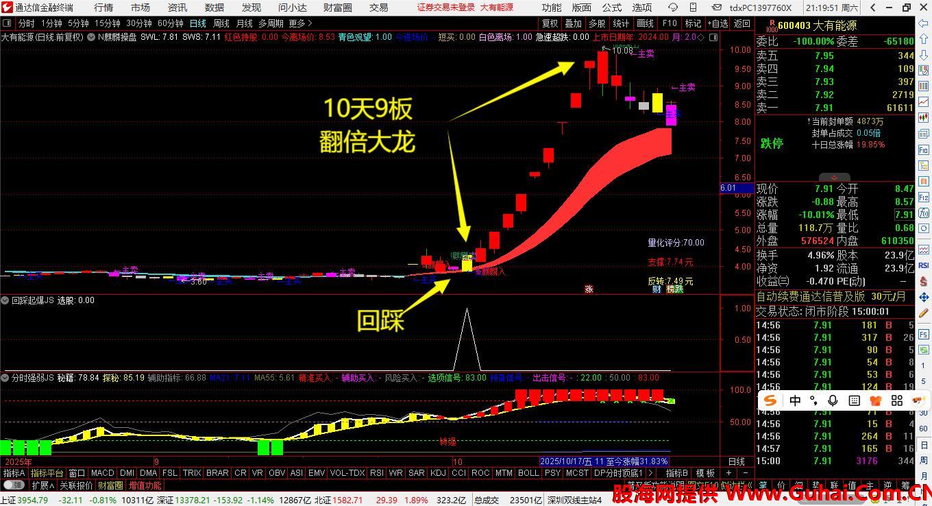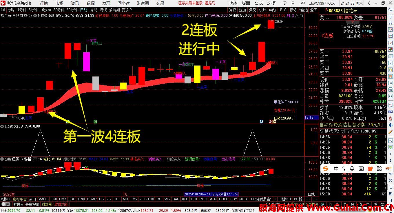 相关简介:【回踩首板起爆策略】选股策略的核心思路和特点是通过趋势+动量+量价+龙头四维验证,专抓首板启动的龙头、妖股、牛股等,特点: 1.趋势护航:短期均线强势上扬且站稳长期均线,确保个股处于上升通道。 2.秘籍信号:独创动量指标突破关键位置并向上发力,预示上涨动能激活。 3.量价共振:成交量突增与价格大涨形成合力,或未合力但排除弱势情形。 4.操作线提示:操作线回落至震仓线或抄底线附近,结合近期涨停基因,捕捉洗盘结束信号。 5.龙头属性:个股站上年线且所属板块近期强势,确保标的为资金关注焦点。 6.风险控制:首板启动,避免追高接盘。