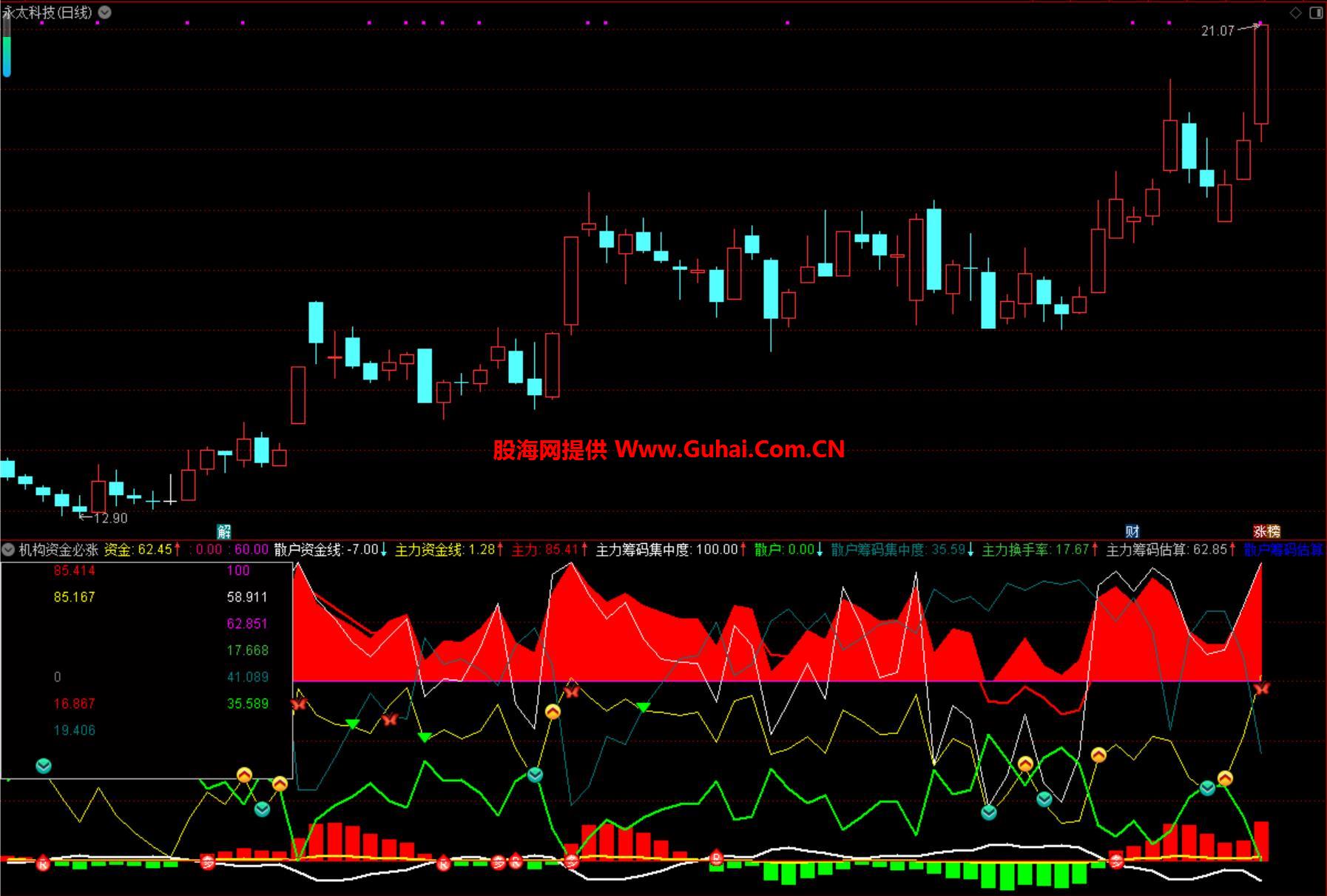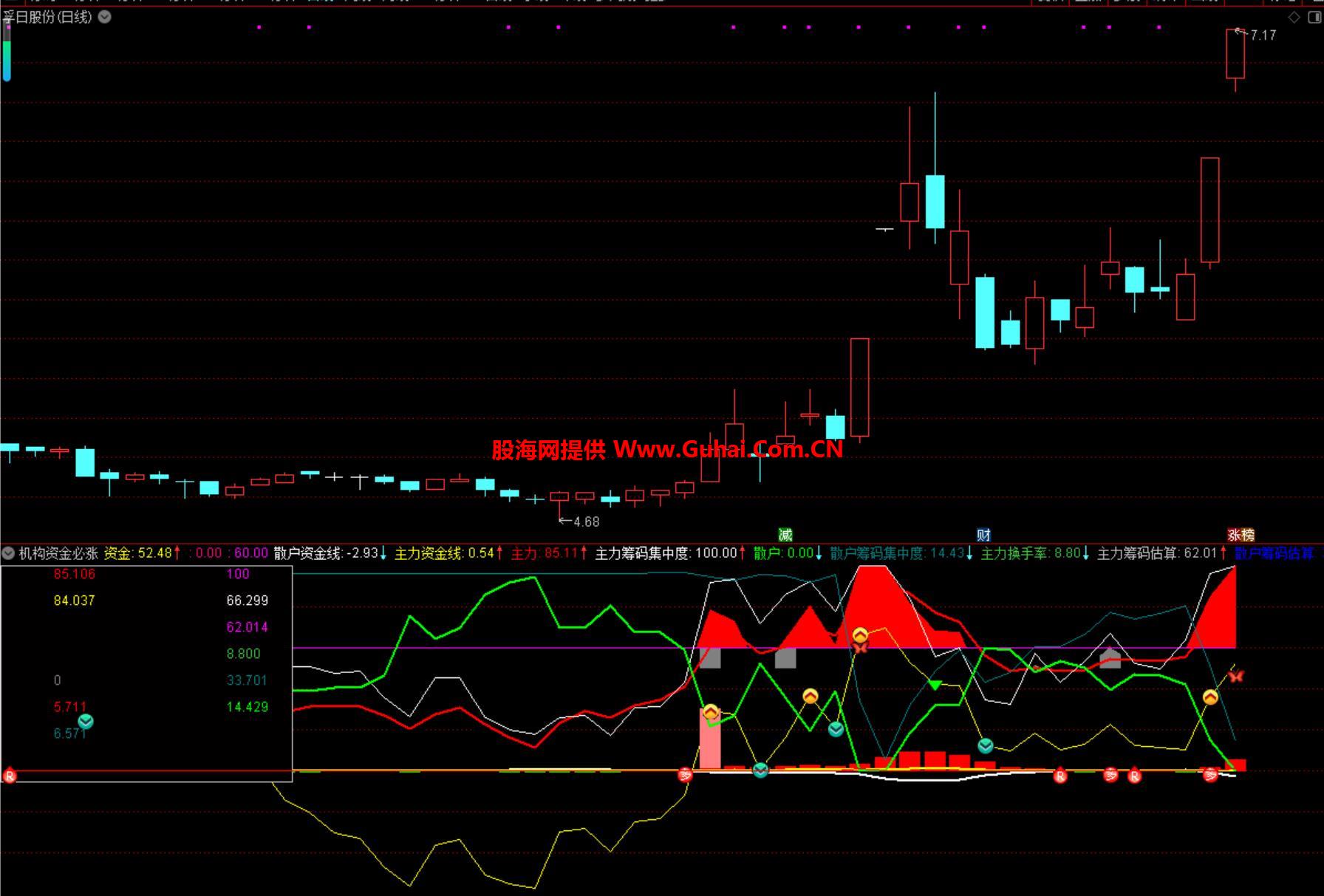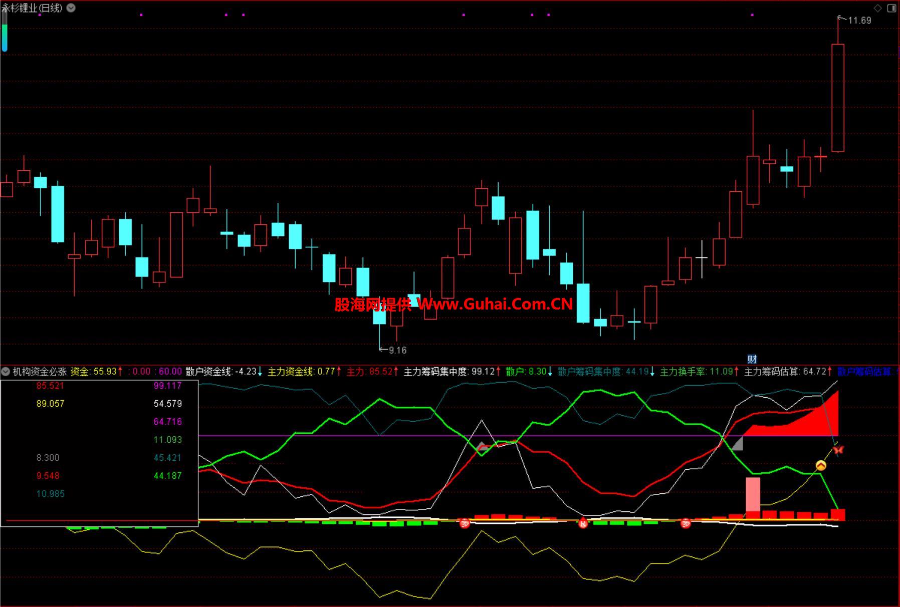 相关简介:机构资金必涨 副图选股指标优化版 给买入信号做了整理 分析主力筹码和主力控盘指标